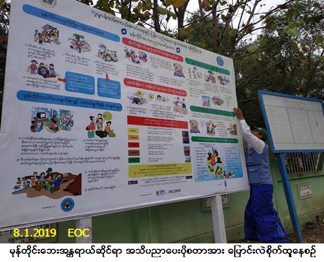 လူမှုဝန်ထမ်း၊ ကယ်ဆယ်ရေးနှင့် ပြန်လည်နေရာချထားရေးဝန်ကြီးဌာန၊ ဘေးအန္တရာယ်ဆိုင်ရာ စီမံခန့်ခွဲမှုဦးစီးဌာန၊ ကန့်ဘလူခရိုင်ဦးစီးမှူးရုံးမှ တာဝန်ရှိသူများသည် ကန့်ဘလူမြို့၊ မြို့မဈေး၊ အ.ထ.က(၁)လမ်းထောင့်၌ ယခင်က မီးဘေးအသိပညာပေးပိုစတာဆိုင်းဘုတ်စိုက်ထူထားရာမှ (၈-၁-၂၀၁၉) ရက်နေ့၊ နံနက် (၁၁း၀၀) နာရီအချိန်တွင် မုန်တိုင်းဘေးအန္တရာယ်ဆိုင်ရာ အသိပညာပေးပိုစတာဆိုင်းဘုတ်အား ပြောင်းလဲစိုက်ထူပြီးဖြစ်ပါကြောင်း သတင်း ရရှိပါသည်။