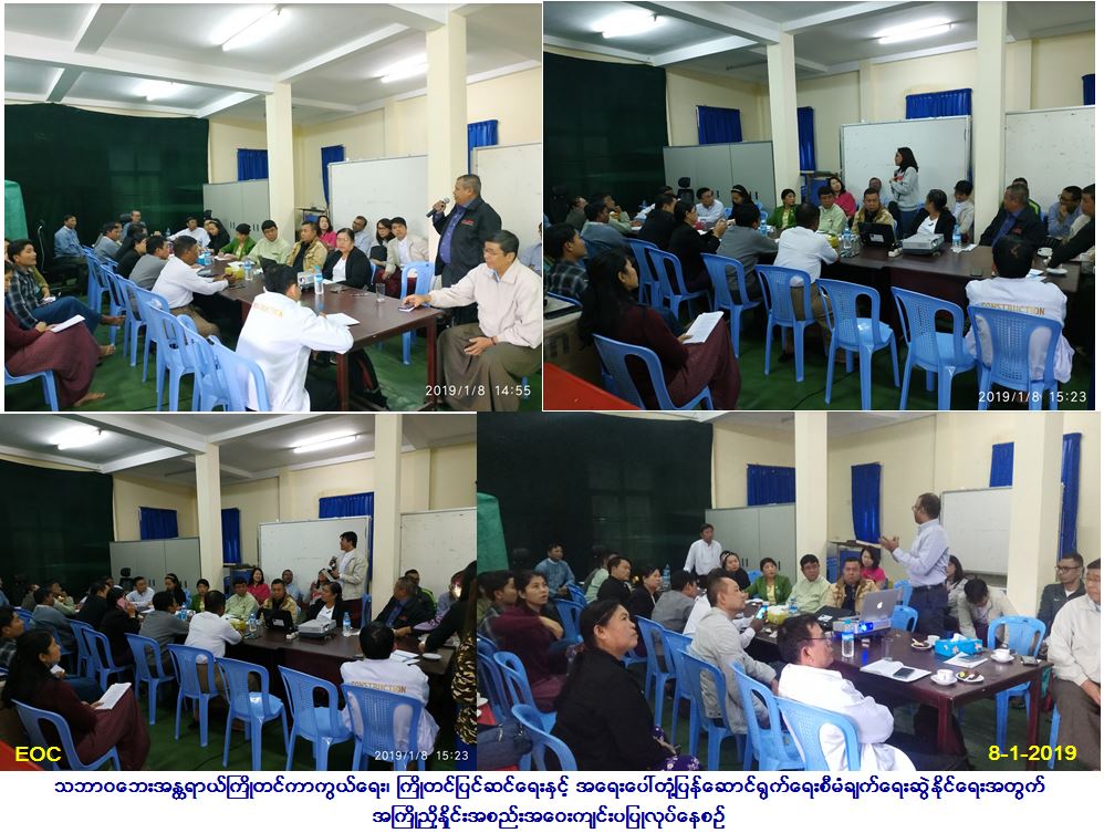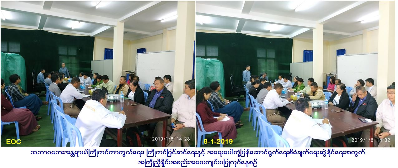 လူမှုဝန်ထမ်း၊ ကယ်ဆယ်ရေးနှင့်ပြန်လည်နေရာ ချထားရေးဝန်ကြီးဌာန၊ ဘေးအန္တရာယ်ဆိုင်ရာ စီမံခန့်ခွဲမှုဦးစီးဌာန၊ ဧရာဝတီတိုင်းဒေသကြီး ဦးစီးမှူးရုံးမှ တာဝန်ရှိသူများဦးဆောင်၍ (၈-၁-၂၀၁၉)ရက်နေ့ (၁၄း၀၀)နာရီအချိန်တွင် ဘေးအန္တရာယ်ဆိုင်ရာစီမံခန့်ခွဲမှုဦးစီးဌာန၊ ဧရာဝတီ တိုင်းဒေသကြီးဦးစီးမှူးရုံး၊ အစည်းအဝေးခန်းမ၌ သဘာဝဘေး အန္တရာယ်ကြိုတင်ကာကွယ်ရေး၊ ကြိုတင်ပြင်ဆင်ရေးနှင့် အရေးပေါ်တုံ့ပြန် ဆောင်ရွက်ရေးစီမံချက်ရေးဆွဲနိုင်ရေးအတွက် အကြိုညှိနှိုင်းအစည်းအဝေးအား ကျင်းပပြုလုပ်ခဲ့ပါသည်။ အဆိုပါ အစည်းအဝေးတွင် ဧရာဝတီတိုင်းဒေသကြီး အစိုးရအဖွဲ့၊ လူမှုရေးဝန်ကြီး ဒေါက်တာလှမြတ်သွေးမှ အဖွင့်အမှာ စကားပြောကြားပြီး တိုင်းဒေသကြီးဦးစီးမှူးမှ အစည်း အဝေးခေါ်ယူကျင်းပရခြင်း၏ ရည်ရွယ်ချက်အား ရှင်းလင်းပြောကြားခြင်း၊ တက်ရောက်လာသော တိုင်းဒေသကြီးအဆင့် ဌာနဆိုင်ရာများ၊ NGO/INGO အဖွဲ့အစည်းများမှ စီမံချက်အကောင် အထည်ဖော်နိုင်ရေးအတွက် ဝိုင်းဝန်း အကြံပြုဆွေးနွေးခြင်းဖြင့် ဆောင်ရွက် ခဲ့ကြောင်း သတင်းရရှိပါသည်။