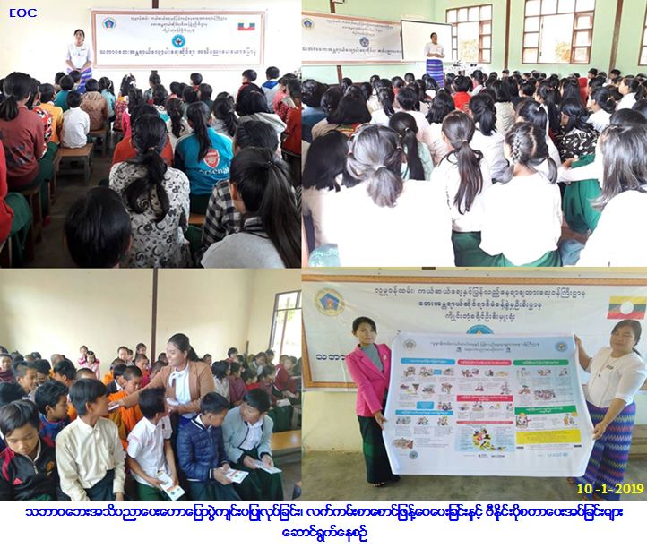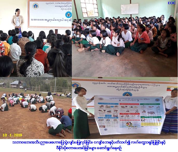 လူမှုဝန်ထမ်း၊ ကယ်ဆယ်ရေးနှင့် ပြန်လည်နေရာချထားရေးဝန်ကြီးဌာန၊ ဘေးအန္တရာယ်ဆိုင်ရာစီမံခန့်ခွဲမှုဦးစီးဌာန၊ ကျိုင်းတုံခရိုင် ဦးစီးမှူးရုံးမှ တာဝန်ရှိသူများသည် (၁၀-၁-၂၀၁၉) ရက်နေ့၊ နံနက် (၀၉း၀၀) အချိန်မှ (၁၁း၃၀) နာရီအချိန်ထိ ကျိုင်းတုံမြို့၊ ပန်လော့ကျေးရွာအုပ်စု အခြေခံပညာမူလတန်းလွန်ကျောင်းတွင် ကျောင်းသား/သူ (၁၅၀) ဦးတို့အားလည်းကောင်း၊ (၁၃း၀၀) အချိန်မှ (၁၅း၀၀) နာရီအချိန်ထိ နောင်ဆာကျေးရွာ အခြေခံပညာအလယ်တန်းကျောင်းတွင် ကျောင်းသား/သူ (၁၆၀) ဦးအား လည်းကောင်း သဘာဝဘေးအသိပညာပေးဟောပြောပွဲများ ကျင်းပပြုလုပ်ခဲ့ပြီး အဆိုပါဟောပြောပွဲတွင် ဦးစီးဌာန လုပ်ငန်း ဆောင်ရွက်မှုများ၊ သဘာဝဘေးအန္တရာယ်ဆိုင်ရာ ဆောင်ရန်/ရှောင်ရန်အကြောင်းအရာများ၊ ဗီဒီယိုပြသခြင်း၊ ငလျင်ဘေးနှင့် ပတ်သက်၍ လက်တွေ့သရုပ်ပြသခြင်း၊ လက်ကမ်းစာစောင်များဖြန့်ဝေပေးခြင်းနှင့် ဗီနိုင်းပိုစတာဖြန့်ဝေပေးခြင်းများကို ဆောင်ရွက်ခဲ့ပါကြောင်း သတင်းရရှိပါသည်။