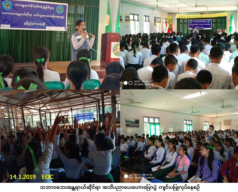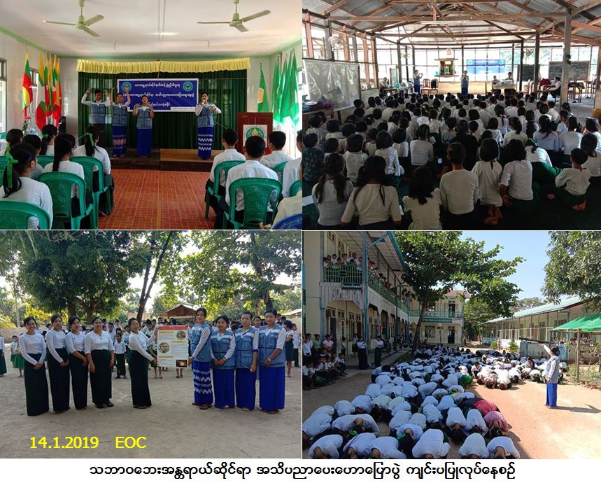 လူမှုဝန်ထမ်း၊ ကယ်ဆယ်ရေးနှင့် ပြန်လည်နေရာချထားရေးဝန်ကြီးဌာန၊ ဘေးအန္တရာယ်ဆိုင်ရာ စီမံခန့်ခွဲမှုဦးစီးဌာန၊ သထုံခရိုင်ဦးစီးမှူးရုံးမှ တာဝန်ရှိသူများသည် မွန်ပြည်နယ်၊ သထုံမြို့နယ်၊ ဒေးဗရိန်း၊ အ.ထ.က(ခွဲ) ၌ (၁၄-၁-၂၀၁၉) ရက်နေ့၊ (၁၀:ဝဝ) နာရီမှ (၁၁:၃၀) နာရီအထိ ကျောင်းသား/သူ (၂၆၀) ဦးအားလည်းကောင်း၊ မွန်ပြည်နယ်၊ သထုံမြို့နယ်၊ အ.မ.က (မူလွန်) သရက်တော၌ နေ့လယ် (၁းဝဝ) နာရီမှ (၂း၃၀) နာရီအထိ ကျောင်းသား/သူ (၂၀၀) ဦးအားလည်းကောင်း သဘာဝဘေးအန္တရာယ်ဆိုင်ရာ အသိပညာပေးဟောပြောခြင်း တို့ဆောင်ရွက်ခဲ့ပြီး ကျောင်းဝန်းများအတွင်း၌ နံရံကပ်ပိုစတာကပ်ခြင်းတို့ ဆောင်ရွက်ခဲ့ပါကြောင်း သတင်း ရရှိပါသည်။