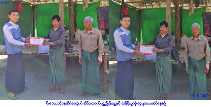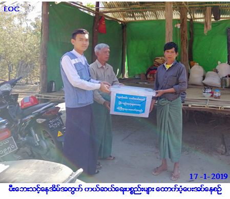 လူမှုဝန်ထမ်း၊ ကယ်ဆယ်ရေးနှင့် ပြန်လည်နေရာချထားရေးဝန်ကြီးဌာန၊ ဘေးအန္တရာယ်ဆိုင်ရာစီမံခန့်ခွဲမှုဦးစီးဌာန၊ ပခုက္ကူခရိုင်ဦးစီးမှူးရုံးမှ တာဝန်ရှိသူများသည် ပခုက္ကူခရိုင်၊ ပေါက်မြို့နယ်၊ အိုင့်ကိုင်းကျေးရွာအုပ်စု၊ အိုင့်ကိုင်းကျေးရွာ၌ (၁၆-၁-၂၀၁၉) ရက်နေ့တွင် ဖြစ်ပွားခဲ့သော မီးဘေးကြောင့် ဘေးသင့်အိမ်ခြေ (၁) လုံး၊ အိမ်ထောင်စု (၁) စုမှ လူဦးရေ (၅) ဦးအတွက် ကယ်ဆယ်ရေးပစ္စည်း (၁၅) မျိုး၊ အိမ်ဆောက်ပစ္စည်းဖိုးငွေ (၄၀,၀၀၀/-) ကျပ်နှင့် ဆန်ရိက္ခာဖိုးငွေ (၇) ရက်စာ (၁၀,၅၀၀/-) ကျပ်၊ စုစုပေါင်း ထောက်ပံ့ငွေ (၅၀,၅၀၀/-) ကျပ် တို့အား (၁၇-၁-၂၀၁၉) ရက်နေ့တွင် ကျေးရွာအုပ်ချုပ်ရေးမှူနှင့်အတူ ဘေးသင့်ပြည်သူများ လက်ဝယ်အရောက် သွားရောက်ထောက်ပံ့ပေးအပ်ခဲ့ကြောင်း သတင်းရရှိပါသည်။