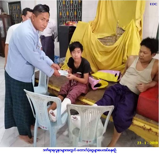 လူမှုဝန်ထမ်း၊ ကယ်ဆယ်ရေးနှင့် ပြန်လည်နေရာချထားရေးဝန်ကြီးဌာန၊ ဘေးအန္တရာယ်ဆိုင်ရာစီမံခန့်ခွဲမှုဦးစီးဌာန၊ ရန်ကုန်တိုင်းဒေသကြီးဦးစီးမှူးရုံးမှ တာဝန်ရှိသူများသည် ရန်ကုန်တိုင်းဒေသကြီး၊ စမ်းချောင်းမြို့နယ်၊ လင်းလွန်းတောင်ရပ်ကွက်၊ ဗဟိုလမ်းနှင့် ကျိုက်လတ်လမ်းထောင့်ရှိ ငွေတောင်လက်ဖက်ရည်ဆိုင်၌ (၂၃-၁-၂၀၁၉) ရက်နေ့၊ နံနက် (၀၅း၃၅) နာရီအချိန်တွင် ဂက်စ်အိုးပေါက်ကွဲမှုကြောင့် မီးလောင်မှုဖြစ်ပွားခဲ့ရာ သွပ်မိုး/ပျဉ်ကာ (၂) ထပ်အိမ် (၁) လုံးနှင့် တိုက်ခန်း (၄) ခန်း မီးလောင်ဆုံးရှုံးခဲ့ပြီး အိမ်ထောင်စု (၅) စု မီးဘေးသင့်ခဲ့ပါသည်။ အဆိုပါ မီးဘေးကြောင့် သေဆုံးသူ (၃) ဦးအတွက် ထောက်ပံ့ငွေ (၉၀၀,၀၀၀/-) ကျပ်၊ ဒဏ်ရာရလူနာ (၂) ဦးအတွက် ထောက်ပံ့ငွေ (၅၀,၀၀၀/-) ကျပ်၊ အိမ်ဆောက်ပစ္စည်းဖိုးငွေ (၆၀၀,၀၀၀/-) ကျပ်၊ ကယ်ဆယ်ရေးပစ္စည်း (၁၆) မျိုး (၅) အိမ်ထောင်စာနှင့် လူဦးရေ (၅၃) ဦးအတွက် ဆန်ရိက္ခာဖိုးငွေ (၇) ရက်စာ (၁၁၁,၃၀၀/-) ကျပ်၊ စုစုပေါင်းထောက်ပံ့ငွေ (၁,၇၁၁,၃၀၀/-) ကျပ်၊ ရေသန့် (၅) လီတာ (၄၀) ဗူး၊ စားဆီ (၅)ပိဿာ (၁) ပုံး၊ ဒန်အိုး (၅) လုံးနှင့် စောင် (၁၀) ထည်တို့အား (၂၃-၁-၂၀၁၉) ရက်နေ့တွင် သွားရောက်ထောက်ပံ့ပေးအပ်ခဲ့ကြောင်း သတင်းရရှိပါသည်။