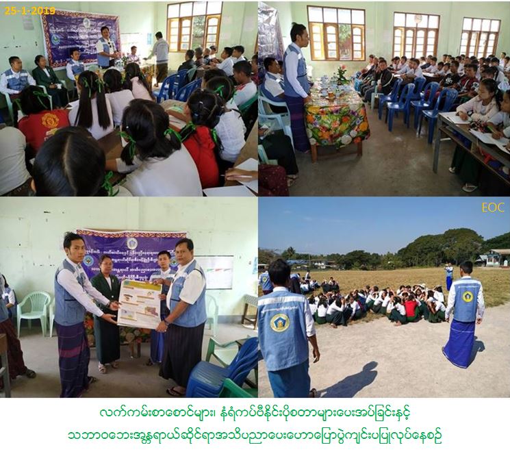လူမှုဝန်ထမ်း၊ ကယ်ဆယ်ရေးနှင့်ပြန်လည်နေရာချထားရေးဝန်ကြီးဌာန၊ ဘေးအန္တရာယ်ဆိုင်ရာစီမံခန့်ခွဲမှု ဦးစီးဌာန၊ မြဝတီခရိုင်ဦးစီးမှူးရုံးမှတာဝန်ရှိသူများသည် (၂၄.၁.၂၀၁၉) ရက်နေ့၊ နံနက် (၀၉၃၀)အချိန်၌ မြဝတီမြို့၊ မဲ့ထော်သလေးကျေးရွာ အခြေခံပညာအထက်တန်းကျောင်း(ခွဲ)တွင် အုပ်ချုပ်ရေးမှူးရုံးမှတာဝန်ရှိသူများ၊ ဆရာ/ဆရာမများနှင့် ကျောင်းသား/ကျောင်းသူ(၁၀၀)ဦးတို့အား သဘာဝဘေးအန္တရာယ်များနှင့်ပတ်သက်၍ ဆောင်ရန် ရှောင်ရန်အချက်အလက်များအား အသိပညာပေးဟောပြောခဲ့ပြီး၊ ဘေးအန္တရာယ်ကျရောက်စဉ် နေထိုင်နည်း၊ ရှောင်ရှားနည်းများအားသရုပ်ပြခြင်း၊ နံရံကပ်ပိုစတာများနှင့် လက်ကမ်းစာစောင်များကို တက်ရောက်လာသူများအား ဖြန့်ဝေပေးခဲ့ကြောင်း သတင်းရရှိပါသည်။