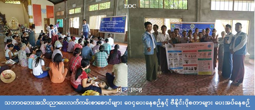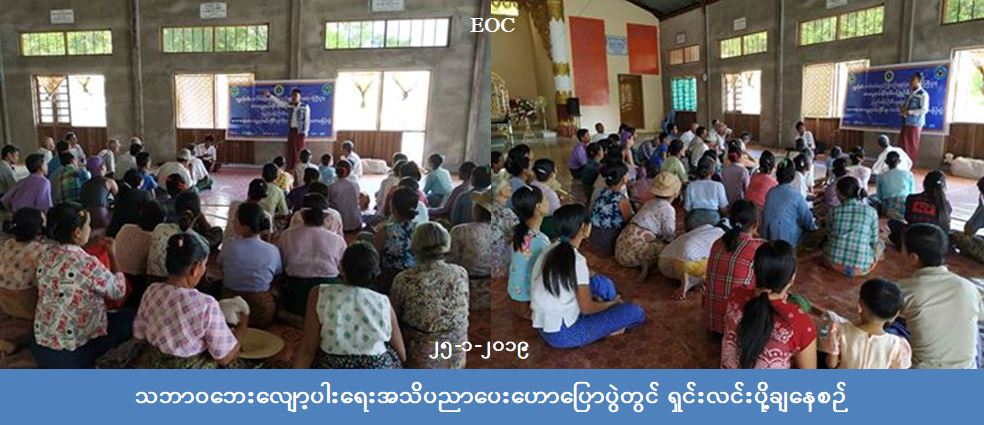 လူမှုဝန်ထမ်း၊ ကယ်ဆယ်ရေးနှင် ပြန်လည်နေရာချထားရေးဝန်ကြီးဌာန၊ ဘေးအန္တရာယ်ဆိုင်ရာစီမံခန့်ခွဲမှု ဦးစီး ဌာန၊ ပြည်ခရိုင်ဦးစီးမှူးရုံးမှ တာဝန်ရှိသူများသည် (၂၅.၁.၂၀၁၉)ရက်နေ့ (၁၃:၀၀) နာရီအချိန်တွင် ပေါင်းတည် မြို့နယ်၊ ကြာနီကန်ကျေးရွာအုပ်စု၊ ရှားပေါင်ကျေးရွာ၊ ဘုန်းတော်ကြီး ကျောင်းဓမ္မာရုံတွင် လူဦးရေ (၁၅၀) ဦးခန့် အား သဘာဝဘေးလျော့ပါးရေး အသိပညာပေး ဟောပြောဆွေးနွေးခဲ့ပြီး လက်ကမ်းစာစောင်များနှင့် ခေါက်ဆွဲခြောက်များဝေငှပေးခဲ့ကြောင်းနှင့် ရပ်ကွက်အုပ်စုအုပ်ချုပ်ရေးမှူးထံသို့ မီးဘေး/ရေဘေး ဗီနိုင်းပိုစတာ များ ပေးအပ်ခဲ့ကြောင်း သိရှိရပါသည်။