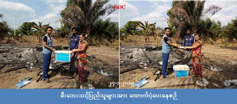 လူမှုဝန်ထမ်း၊ ကယ်ဆယ်ရေးနှင့် ပြန်လည်နေရာချထားရေးဝန်ကြီးဌာန၊ ဘေးအန္တရာယ်ဆိုင်ရာစီမံ ခန့်ခွဲမှုဦးစီးဌာန၊ မြိတ်ခရိုင်ဦးစီးမှူးရုံးမှ တာဝန်ရှိသူများသည် (၂၅.၁.၁၉)ရက်နေ့ မြိတ်ခရိုင်၊ တနင်္သာရီမြို့နယ်၊ ချောင်းလမု ကျေးရွာ မီးဘေးဖြစ်ပွားခဲ့ရာ ဘေးသင့်အိမ်ထောင်စု(၁) စုအတွက် ကယ်ဆယ်ရေးပစ္စည်း (၁၅) မျိုး၊ မီးလောင် ကျွမ်းနေအိမ် (၁)လုံး အတွက် အိမ်ဆောက်ပစ္စည်းဖိုး (၁)သိန်း၊ ဘေးသင့်လူဦးရေ(၅)ဦးအတွက် ဆန်ဘိုး (၁၀,၅၀၀) ကျပ်တို့အား (၂၇.၁.၁၉) ရက်နေ့တွင် သွားရောက်ထောက်ပံ့ပေးအပ်ခဲ့ကြောင်း သိရှိရပါ သည်။