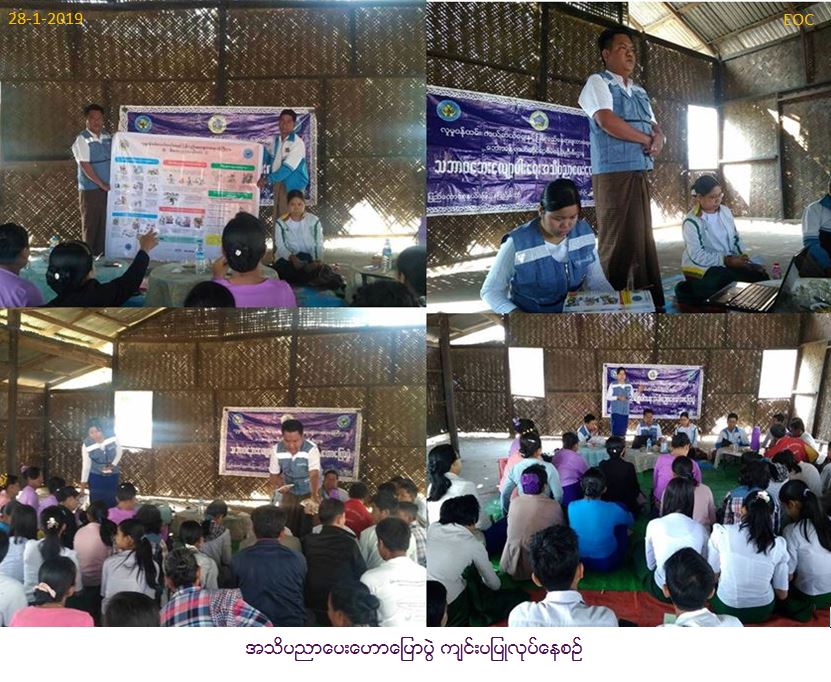လူမှုဝန်ထမ်း၊ ကယ်ဆယ်ရေးနှင့် ပြန်လည်နေရာချထားရေးဝန်ကြီးဌာန၊ ဘေးအန္တရာယ်ဆိုင်ရာ စီမံခန့်ခွဲ မှုဦးစီးဌာန၊ ပြည်ထောင်စုနယ်မြေ နေပြည်တော်တိုင်းဦးစီးမှူးရုံးမှ တာဝန်ရှိသူများသည် (၂၈-၁-၂၀၁၉)ရက်နေ့၊ (၀၉း၃၀)နာရီမှ(၁၁း၀၀)နာရီ အချိန်ထိ ဇေယျာသီရိမြို့နယ် ၊ပြည်စံအောင်ရပ်ကွက်တွင် ရပ်ကွက်သူ/ရပ်ကွက်သား (၇၀)ဦးတို့အား သဘာဝဘေး အသိ ပညာများဟောပြောဆောင်ရွက်ခဲ့ပြီး ရပ်ကွက်အတွက်ဗီနိုင်းပိုစတာနှင့် ဟောပြောပွဲတက်ရောက်သူများအား လက်ကမ်းစာစောင်နှင့်မုန့်များ ဖြန့်ဝေခဲ့ကြောင်း သိရှိရပါသည်။