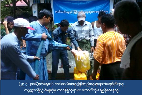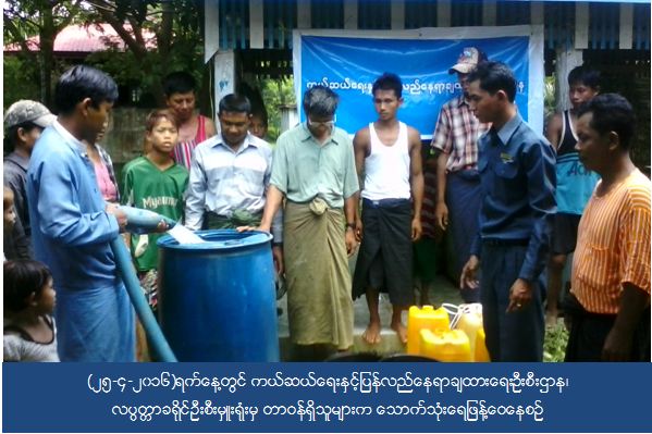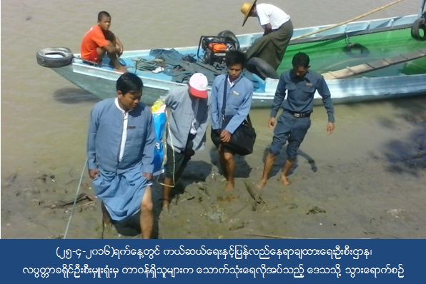 ကယ်ဆယ်ရေးနှင့် ပြန်လည်နေရာချထားရေးဦးစီးဌာန၊ လပွတ္တာခရိုင်ဦးစီးမှူးရုံးမှ တာဝန်ရှိသူများသည် (၂၅-၄-၂၀၁၆) ရက်နေ့တွင် ဧရာဝတီတိုင်းဒေသကြီး၊ လပွတ္တာခရိုင်၊ မော်လမြိုင်ကျွန်းမြို့နယ်၊ မဘေကျေးရွာအုပ်စု၊ မိချောင်းဂေါင်းကျေးရွာရှိ အိမ်ခြေ (၈၃)လုံး၊ အိမ်ထောင်စု (၈၃)စု၊ လူဦးရေ (၃၃၄) ဦးအတွက် သောက်သုံးရေ ဂါလံ (၂၀၀၀) ဖြန့်ဝေပေးခဲ့ကြောင်း သိရှိရပါသည်။