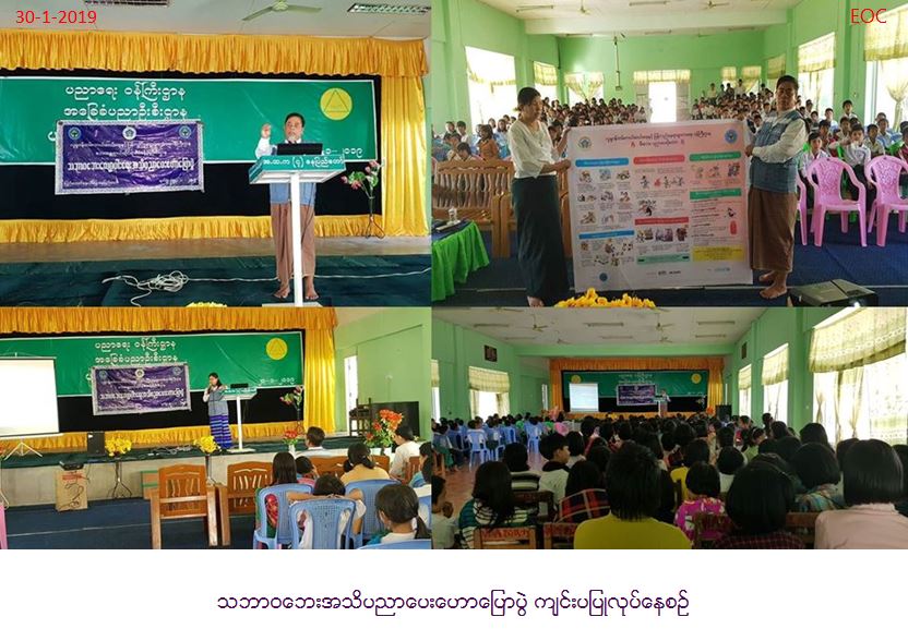 လူမှုဝန်ထမ်း၊ ကယ်ဆယ်ရေးနှင့် ပြန်လည်နေရာချထားရေးဝန်ကြီးဌာန၊ ဘေးအန္တရာယ်ဆိုင်ရာစီမံခန့်ခွဲမှုဦးစီးဌာန၊ ပြည်ထောင်စုနယ်မြေ နေပြည်တော်တိုင်းဦးစီးမှူးရုံးမှတာဝန်ရှိသူများသည် (၃၀-၁-၂၀၁၉)ရက်နေ့၊ (၁၃း၀၀)နာရီမှ(၁၄း၃၀) နာရီအချိန်ထိ ဇမ္ဗူသီရိမြို့နယ် ၊အ.ထ.က(၇)စာသင်ကျောင်းတွင် ကျောင်းသူ/ကျောင်းသား (၂၇၀)ဦးတို့အား သဘာဝဘေး အသိပညာများ ဟောပြောခဲ့ပြီး ကျောင်းအတွက်ဗီနိုင်းပိုစတာများ၊ ဟောပြောပွဲတက်ရောက်သူများအား လက်ကမ်းစာစောင်နှင့် ဘောပင်များ ဖြန့်ဝေခဲ့ကြောင်း သတင်းရရှိပါသည်။