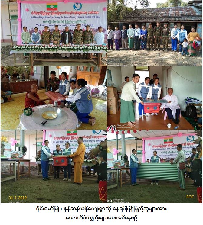 လူမှုဝန်ထမ်း၊ ကယ်ဆယ်ရေးနှင့် ပြန်လည်နေရာချထားရေးဝန်ကြီးဌာန၊ ဘေးအန္တရာယ်ဆိုင်ရာစီမံခန့်ခွဲမှု ဦးစီးဌာန၊ ကချင်ပြည်နယ်ဦးစီးမှူးရုံးမှတာဝန်ရှိသူများသည် (၃၀.၁.၂၀၁၉)ရက်နေ့ (၀၈း၀၀)နာရီအချိန်တွင် ကချင်ပြည်နယ်၊ ဝိုင်းမော်မြို့နယ် ၊နန်ဆန်ယန်ကျေးရွာမှ မြို့ပေါ်ရပ်ကွက်ကျေးရွာများသို့ ရောက်ရှိနေသော တိုက်ပွဲရှာင်ပြည်သူ အိမ်ထောင်စု (၁၅)စု၊ လူဦးရေ (၁၀၅)ဦးနှင့် ဘုန်းတော်ကြီး(၁)ပါး၊ ခရစ်ယာန်ဘုန်းတော်ကြီး(၁)ပါးတို့အား လုံခြုံရေးနှင့်နယ်စပ်ရေးရာဝန်ကြီးဦးဆောင်သော ဌာနဆိုင်ရာအဖွဲ့များမှ နန်ဆန်ယန်ကျေးရွာသို့ လိုက်ပါပို့ဆောင် ရွှေ့ပြောင်းပေးခဲ့ရာပြီး ကယ်ဆယ်ရေးပစ္စည်း(၁၁)မျိုး(၂) ပါးစာ၊ ကယ်ဆယ်ရေး ပစ္စည်း(၁၇ )မျိုး (၁၅)အိမ်ထောင်စာ၊ ၊ စားနပ်ရိက္ခာ(၁)လစာငွေ(၁၁၈၇၆၂၅/-)နှင့် ပြောင်းရွှေ့ /အိမ်ဆောက်/ ကျောင်းဆောက်ပစ္စည်းဖိုးငွေ( ၂၀၇၀၀၀၀/-)၊ MEC(၇)ပေသွပ် (၁၈၀)ချပ်၊ မြောက်ပိုင်းတိုင်းစစ်ဌာနချုပ်မှ ဆန်၊ဆီ၊ ပဲ၊ ဆား ၊ ကြက်သွန်နီ၊ ကြက်သွန်ဖြူ ၊ အာလူး၊ ဆပ်ပြာ၊ သွားတိုက်ဆေး၊ သွားတိုက်တံ၊ ကျန်းမာရေး ဦးစီးဌာနမှ ဆေးစိမ်ခြင်ထောင် အသီးသီးတို့ကို ထောက်ပံ့ပေးအပ်ခဲ့ကြပြီး အိမ်တိုင်ရာရောက်ပြောင်းရွှေ့ပေးမှု အစီအစဉ်အား (၁၄း၃၀)နာရီအချိန်တွင် ပြီးဆုံးခဲ့ပါကြောင်း သတင်းရရှိပါသည်။