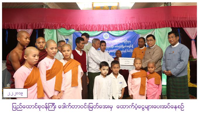 ထို့နောက် ပြည်ထောင်စုဝန်ကြီးနှင့်အဖွဲ့ကကျောက်စရစ်ကုန်းလူငယ်ဖွံ့ဖြိုးရေးပရဟိတဂေဟာအတွက်ထောက်ပံ့ငွေ (၉၃၄၂၀၀ဝိ)ကျပ်၊ ကိုယ့်အားကိုယ်ကိုးမူကြိုကျောင်းများဖြစ်သောဒဟတ်ကုန်းမူကြို၊ အမှတ်(၁)ကာကွယ်ရေးပစ္စည်းစက်ရုံမူကြို၊ အမှတ်(၄)ကာကွယ်ရေးပစ္စည်းစက်ရုံမူကြို၊ တပ်မတော်ဆေးသုတေသနတပ်မူကြို၊ အမှတ်(၁၀၉) ခြေမြန်တပ်ရင်းမူကြို၊ အမှတ်(၂၀၃၂)လေကြောင်းရန်ကာကွယ်ရေးတပ်မူကြိုတို့အတွက် ထောက်ပံ့ငွေကျပ်(၃၆)သိန်း၊ ကျောက်စရစ်ကုန်း၊ ကင်မွန်းတန်းအရှေ့၊ အောင်မြင်ရိပ်သာကျေးရွာများတွင် ဖွင့်လှစ်မည့် မိခင်ဝိုင်း(၃)ဝိုင်းအတွက် ထောက်ပံ့ငွေကျပ် (၉၇၈,၀၀၀) တို့ကိုထောက်ပံ့ပေးအပ်ရာတာဝန်ရှိသူများကလက်ခံရယူကြပြီးတပ်ကုန်းမြို့နယ် ပြည်သူ့လွှတ်တော်ကိုယ်စားလှယ် ဦးကျော်တင့် က ကျေးဇူးတင်စကား ပြန်လည်ပြောကြားခဲ့ပါသည်။