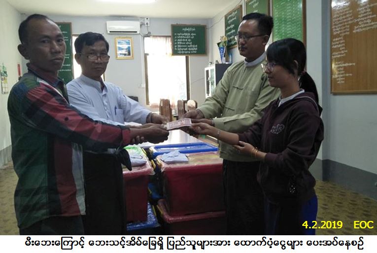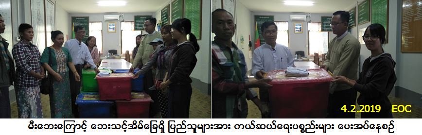 လူမှုဝန်ထမ်း၊ ကယ်ဆယ်ရေးနှင့် ပြန်လည်နေရာချထားရေးဝန်ကြီးဌာန၊ ဘေးအန္တရာယ်ဆိုင်ရာ စီမံခန့်ခွဲမှုဦးစီးဌာန၊ ကလေးခရိုင်ဦးစီးမှူးရုံးမှတာဝန်ရှိသူများသည် စစ်ကိုင်းတိုင်းဒေသကြီး၊ ကလေးခရိုင်၊ ကလေးမြို့၊ နယ်မြေ (၁) ၌ (၁-၂-၂၀၁၉) ရက်နေ့တွင် ဖြစ်ပွားခဲ့သော မီးဘေးကြောင့် ဘေးသင့်အိမ်ခြေ (၂) လုံး၊ အိမ်ထောင်စု (၈) စုမှ လူဦးရေ (၂၄) ဦးဘေးသင့်ခဲ့ရာ အဆိုပါဘေးသင့်ပြည်သူများအတွက် Family Kits (၈) ပုံး၊ ဆန်ရိက္ခာဖိုး ထောက်ပံ့ငွေ (၅၀,၄၀၀/-) ကျပ်နှင့် အိမ်ဆောက်ပစ္စည်းဖိုးထောက်ပံ့ငွေ (၄၀၀,၀၀၀/-) ကျပ်အား (၄-၂-၂၀၁၉) ရက်နေ့တွင် သွားရောက်ထောက်ပံ့ပေးအပ်ခဲ့ပါကြောင်း သတင်းရရှိပါသည်။
