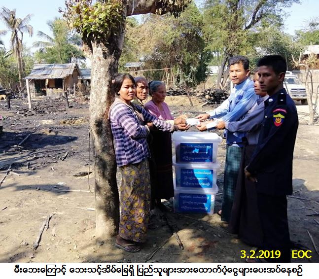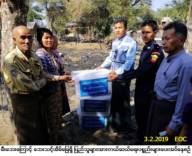 လူမှုဝန်ထမ်း၊ ကယ်ဆယ်ရေးနှင့် ပြန်လည်နေရာချထားရေးဝန်ကြီးဌာန၊ ဘေးအန္တရာယ်ဆိုင်ရာစီမံခန့်ခွဲမှုဦးစီးဌာန၊ ပခုက္ကူခရိုင်ဦးစီးမှူးရုံးမှတာဝန်ရှိသူများသည် ပခုက္ကူမြို့နယ်၊ မြစ်ခြေမြို့၊ အမှတ် (၄) ရပ်ကွက်၌ (၃-၂-၂၀၁၉) ရက်နေ့၊ (၀၈း၄၅) အချိန်တွင် ဖြစ်ပွားခဲ့သောမီးဘေးကြောင့် ဘေးသင့်အိမ်ခြေ (၃) လုံး၊ အိမ်ထောင်စု (၃) စုမှ လူဦးရေ (၉) ဦးဘေးသင့်ခဲ့ရာ အဆိုပါဘေးသင့်ပြည်သူများအတွက် အိမ်ဆောက်ပစ္စည်းဖိုးထောက်ပံ့ငွေ (၃၀၀,၀၀၀/-) ကျပ်၊ ဆန်ရိက္ခာဖိုးထောက်ပံ့ငွေ (၁၈,၉၀၀/-) ကျပ်၊ စုစုပေါင်းထောက်ပံ့ငွေ (၃၁၈,၉၀၀/-) ကျပ်နှင့် ကယ်ဆယ်ရေးပစ္စည်း (၁၆) မျိုး အိမ်ထောင်စု (၂) စုစာ၊ ကယ်ဆယ်ရေးပစ္စည်း (၁၅) မျိုး အိမ်ထောင်စု (၁) စုစာတို့အား (၃-၂-၂၀၁၉) ရက်နေ့တွင် မြို့နယ်မီးသတ်ဦးစီးဌာန၊ မြစ်ခြေယာယီတာဝန်ခံနှင့် ကျေးရွာအုပ်ချုပ်ရေးမှူးတို့နှင့်အတူ ဘေးသင့်ပြည်သူများလက်ဝယ်အရောက် ထောက်ပံ့ပေးအပ်ခဲ့ပါကြောင်း သတင်းရရှိပါသည်။