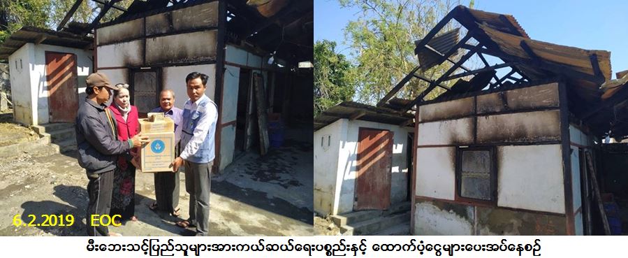 လူမှုဝန်ထမ်း၊ ကယ်ဆယ်ရေးနှင့် ပြန်လည်နေရာချထားရေးဝန်ကြီးဌာန၊ ဘေးအန္တရာယ်ဆိုင်ရာ စီမံခန့်ခွဲမှုဦးစီးဌာန၊ ကျောက်မဲခရိုင်ဦးစီးမှူးရုံးမှတာဝန်ရှိသူများသည် သီပေါမြို့၊ ပန်းတိမ်မြောက်ရပ်ကွက်၊ နယ်မြေ (၅) ၌ (၃-၂-၂၀၁၉) ရက်နေ့၊ (၂၁း၃၅) နာရီအချိန်တွင် ဖြစ်ပွားခဲ့သောမီးဘေးကြောင့် ဘေးသင့်အိမ်ခြေ (၁) လုံး၊ အိမ်ထောင်စု (၁) စုမှ လူဦးရေ (၁၂) ဦးဘေးသင့်ခဲ့ရာ အဆိုပါဘေးသင့်ပြည်သူများအတွက် အိမ်ဆောက်ပစ္စည်းဖိုးထောက်ပံ့ငွေ (၁၀၀,၀၀၀/-) ကျပ်၊ ဆန်ရိက္ခာ(၇)ရက်စာဖိုးထောက်ပံ့ငွေ (၂၅,၂၀၀/-) ကျပ်၊ စုစုပေါင်းထောက်ပံ့ငွေ (၁၂၅,၂၀၀/-) ကျပ်နှင့် ကယ်ဆယ်ရေးပစ္စည်း (၉) မျိုး အိမ်ထောင်စု (၁) စုစာတို့အား (၆-၂-၂၀၁၉) ရက်နေ့၊ (၁၁း၀၀) နာရီအချိန်တွင် ရပ်ကွက်အုပ်ချုပ်ရေးမှူးနှင့်အတူ ဘေးသင့်ပြည်သူများလက်ဝယ်အရောက် သွားရောက် ထောက်ပံ့ပေးအပ်ခဲ့ပါကြောင်း သတင်းရရှိပါသည်။