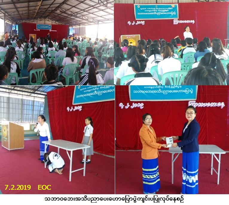 လူမှုဝန်ထမ်း၊ ကယ်ဆယ်ရေးနှင့် ပြန်လည်နေရာချထားရေးဝန်ကြီးဌာန၊ ဘေးအန္တရာယ်ဆိုင်ရာ စီမံခန့်ခွဲမှုဦးစီးဌာန၊ တာချီလိတ်မြို့နယ်ဦးစီးမှူးရုံးမှတာဝန်ရှိသူများသည် (၇-၂-၂၀၁၉) ရက်နေ့၊ နံံနက် (၁၀း၃၀) နာရီအချိန်မှ (၁၂း၀၀) နာရီအချိန်ထိ မကာအိုခမ်းရပ်ကွက်၊ ရွှေမဟာကိုယ်ပိုင် အထက်တန်းကျောင်းအတွင်းရှိ မေဖလားဝါး ကွင်း၌ သဘာဝဘေးအသိပညာပေးဟောပြောပွဲ ကျင်းပပြုလုပ်ခဲ့ရာ ဆရာ/ဆရာမ၊ ကျောင်းသား/သူ၊ စုစုပေါင်း (၁၅၀) ဦးတက်ရောက်ခဲ့ပြီး တက်ရောက်လာသူများအား လက်ကမ်းစာစောင်များဖြန့်ဝေခဲ့ပါကြောင်း သတင်း ရရှိပါသည်။