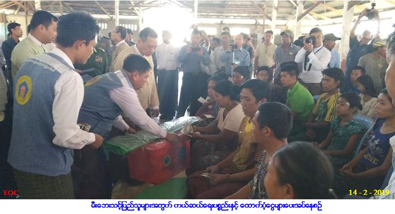 လူမှုဝန်ထမ်း၊ ကယ်ဆယ်ရေးနှင့် ပြန်လည်နေရာချထားရေးဝန်ကြီးဌာန၊ ဘေးအန္တရာယ်ဆိုင်ရာစီမံခန့်ခွဲမှုဦးစီးဌာန၊ ပြည်ထောင်စုနယ်မြေ၊ နေပြည်တော်တိုင်းဦးစီးမှူးရုံးမှ တာဝန်ရှိသူများသည် ပျဉ်းမနားမြို့နယ်၊ ရန်နိုင်ရပ်ကွက်၌ (၁၄-၂-၂၀၁၉) ရက်နေ့၊ (၁၁း၀၅) နာရီအချိန်တွင် ဖြစ်ပွားခဲ့သော မီးဘေးကြောင့် ဘေးသင့်နေအိမ် (၈) လုံးအတွက် ကယ်ဆယ်ရေးပစ္စည်း (၁၇) မျိုး (၈) အိမ်ထောင်စာ၊ အိမ်ဆောက်ပစ္စည်းဖိုးငွေ (၁,၂၀၀,၀၀၀/-) ကျပ်နှင့် လူဦးရေ (၄၆) ဦးအတွက် ဆန်ရိက္ခာဖိုးငွေ (၉၆,၆၀၀/-) ကျပ်၊ စုစုပေါင်း ထောက်ပံ့ငွေ (၁,၂၉၆,၆၀၀/-) ကျပ်တို့အား နေပြည်တော်ကောင်စီဥက္ကဌနှင့် တာဝန်ရှိသူများနှင့်အတူ (၁၄-၂-၂၀၁၉) ရက်နေ့၊ (၁၃း၀၀) နာရီအချိန်တွင် ဘေးသင့်ပြည်သူများလက်ဝယ်သို့ ကွင်းဆင်းထောက်ပံ့ပေးအပ်ခဲ့ကြောင်း သတင်းရရှိပါသည်။