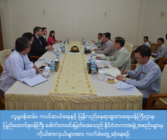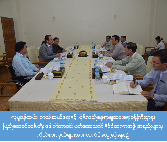 လူမှုဝန်ထမ်း၊ ကယ်ဆယ်ရေးနှင့် ပြန်လည်နေရာချထားရေးဝန်ကြီးဌာန၊ မေခလာခန်းမ တွင် ဧပြီလ၂၅ရက်နေ့ နေ့လည် (၁၃:၃၀) နာရီအချိန်က ပြည်ထောင်စုဝန်ကြီး ဒေါက်တာ ဝင်းမြတ်အေး အား Handicap International Program Director ဖြစ်သူ Mr.Yann Faivre ဦးဆောင်သောအဖွဲ့မှ လာရောက်တွေ့ဆုံခဲ့ပါသည်။ ထိုသို့တွေ့ဆုံရာ၌ မိုင်းကြောင့် ဒုက္ခရောက်သူများ ကူညီပံ့ပိုးရေးနှင့်ပတ်သက်၍ ကရင်ပြည်နယ်၊ ကော့ကရိတ်မြို့တွင် တိုးချဲ့ ဆောင်ရွက်မည့်ကိစ္စရပ်များ၊ မိုင်းအသိပညာပေးဆိုင်ရာကိစ္စများတွင် ပူးပေါင်းဆောင်ရွက်မည့် ကိစ္စများကို ရင်းနှီးပွင့်လင်းစွာ ဆွေးနွေးခဲ့ပါသည်။