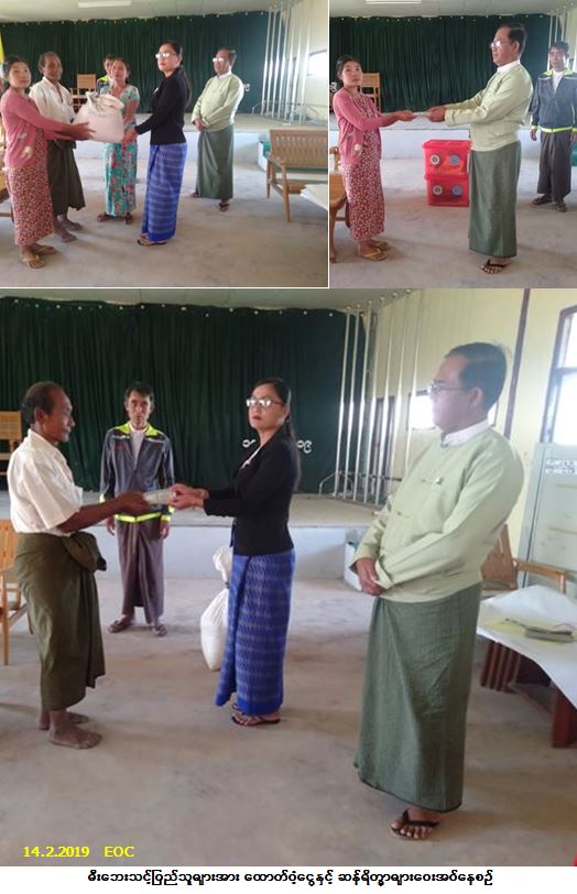 လူမှုဝန်ထမ်း၊ ကယ်ဆယ်ရေးနှင့် ပြန်လည်နေရာချထားရေးဝန်ကြီးဌာန၊ ဘေးအန္တရာယ်ဆိုင်ရာစီမံ ခန့်ခွဲမှုဦးစီးဌာန၊ မြောက်ဦးခရိုင်ဦးစီးမှူးရုံးမှတာဝန်ရှိသူများသည် မြောက်ဦးမြို့နယ်၊ ကျောင်းတောင်ကျေးရွာအုပ်စု၊ မြိုချောင်း ကျေးရွာ၌ (၄-၂-၂၀၁၉) ရက်နေ့တွင်ဖြစ်ပွားခဲ့သောမီးဘေးကြောင့် ဘေးသင့်နေအိမ် (၃) လုံး၊ အိမ်ထောင်စု (၃) စုမှ လူဦးရေ (၇) ဦးဘေးသင့်ခဲ့ရာ အဆိုပါဘေးသင့်ပြည်သူများအတွက် ကယ်ဆယ်ရေးပစ္စည်း (၁၅) မျိုး (၃) အိမ်ထောင်စုစာ၊ အိမ်ဆောက်ပစ္စည်းဖိုးထောက်ပံ့ငွေ (၃၀၀,၀၀၀/-) ကျပ်နှင့် ဆန်ရိက္ခာ (၇) ရက်စာ (၁၂) ပြည်၊ (၂) ဗူးတို့အား (၁၄-၂-၂၀၁၉) ရက်နေ့တွင် မြို့နယ်အုပ်ချုပ်ရေးမှူးနှင့်အတူ ဘေးသင့်ပြည်သူများ လက်ဝယ် အရောက် ထောက်ပံ့ပေးအပ်ခဲ့ပါကြောင်း သတင်းရရှိပါသည်။