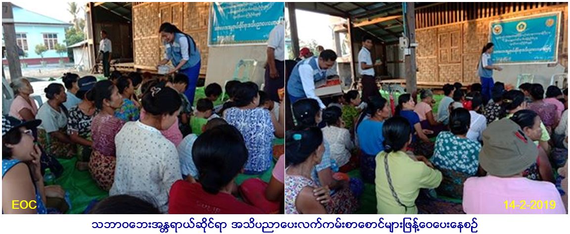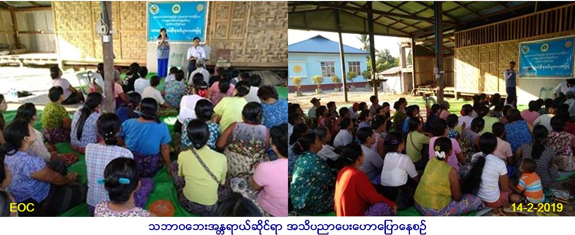 လူမှုဝန်ထမ်း၊ ကယ်ဆယ်ရေးနှင့် ပြန်လည်နေရာချထားရေးဝန်ကြီးဌာန၊ ဘေးအန္တရာယ်ဆိုင်ရာစီမံခန့်ခွဲမှုဦးစီးဌာန၊ ပဲခူးတိုင်းဒေသကြီးဦးစီးမှူး ရုံးမှ တာဝန်ရှိသူများသည် (၁၄-၂-၂၀၁၉)ရက်နေ့ (၁၅းဝဝ)နာရီအချိန်မှ (၁၆းဝဝ)နာရီအချိန်ထိ ပဲခူးတိုင်းဒေသကြီး၊ တောင်ငူခရိုင်၊ တောင်ငူမြို့နယ်၊ (၂၃)ရပ်ကွက်ရှိ ကျေးရွာသူ/သား(၁၅၀)ဦးခန့်အား သဘာဝဘေးအန္တရာယ်နှင့်စပ်လျဉ်း၍ ဆောင်ရန်/ရှောင်ရန်များအား အသိ ပညာပေးဟောပြောခြင်း၊ လက်ကမ်းစာစောင်များဖြန့်ဝေခြင်း၊ ဗီနိုင်းပိုစတာများ ပေးအပ်ခြင်းတို့ ဆောင်ရွက်ခဲ့ကြောင်း သတင်းရရှိပါသည်။