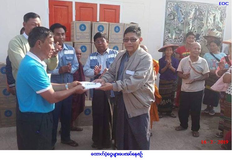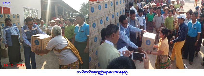 လူမှုဝန်ထမ်း၊ ကယ်ဆယ်ရေးနှင့် ပြန်လည်နေရာချထားရေးဝန်ကြီးဌာန၊ ဘေးအန္တရာယ်ဆိုင်ရာစီမံခန့်ခွဲမှုဦးစီးဌာန၊ ကျောက်မဲခရိုင်ဦးစီးမှူးရုံးမှ တာဝန်ရှိသူများသည် သီပေါမြို့နယ်၊ ကျင်သီကျေးရွာအုပ်စု၊ ဆွန်အွိုက်ဘုန်းကြီး ကျောင်းသို့ ယာယီပြောင်းရွှေ့ရောက်ရှိလာသော တိုက်ပွဲရှောင်အိမ်ထောင်စု (၆၀) စု၊ လူဦးရေ (၁၆၀) ဦးအတွက် ကယ်ဆယ်ရေးပစ္စည်း (၉) မျိုးနှင့် ဆန်ရိက္ခာဖိုးငွေ (၇) ရက်စာ (၃၃၆,၀၀၀/-) ကျပ်တို့အား (၁၆-၂-၂၀၁၉) ရက် နေ့တွင် ပြည်နယ်အစိုးရအဖွဲ့ဝင်၊ ဗမာတိုင်းရင်းသားဝန်ကြီး၊ လူမှုနှင့် ဘေးစီမံမှ ပြည်နယ်မှူးများ၊ သီပေါ မြို့နယ်အုပ်ချုပ်ရေးမှူးတို့နှင့်အတူ ကွင်းဆင်းထောက်ပံ့ပေးအပ်ခဲ့ကြောင်း သတင်းရရှိပါသည်။