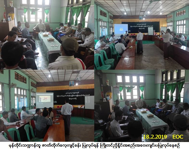 လူမှုဝန်ထမ်း၊ ကယ်ဆယ်ရေးနှင့် ပြန်လည်နေရာချထားရေးဝန်ကြီးဌာန၊ ဘေးအန္တရာယ်ဆိုင်ရာ စီမံခန့်ခွဲမှုဦးစီးဌာန၊ မိုးညိုမြို့နယ်ဦးစီးမှူးရုံးမှတာဝန်ရှိသူများသည် (၁၈-၂-၂၀၁၉) ရက်နေ့၊ နံနက် (၁၀း၀၀) နာရီအချိန်တွင် မိုးညိုမြို့နယ်၊ အထွေထွေအုပ်ချုပ်ရေးဦးစီးဌာနအစည်းဝေးခန်းမ၌ မြို့နယ်သဘာဝဘေးစီမံခန့်ခွဲမှု ကော်မတီဝင် များနှင့်တွေ့ဆုံ၍ မုန်တိုင်းသဏ္ဍာန်တူ ဇာတ်တိုက်လေ့ကျင့်ခန်း ပြုလုပ်ရန် ကြိုတင်ညှိနှိုင်းခြင်း၊ ပြုလုပ်မည့် လုပ်ငန်း အဆင့်ဆင့်ကို ရှင်းလင်းခြင်းတို့ ဆောင်ရွက်ခဲ့ရာ စုစုပေါင်း လူဦးရေ (၂၅) ဦးခန့် တက်ရောက် ခဲ့ပါကြောင်း သတင်းရရှိပါသည်။