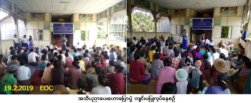 လူမှုဝန်ထမ်း၊ ကယ်ဆယ်ရေးနှင့် ပြန်လည်နေရာချထားရေးဝန်ကြီးဌာန၊ ဘေးအန္တရာယ်ဆိုင်ရာ စီမံခန့်ခွဲမှုဦးစီးဌာန၊ စစ်ကိုင်းတိုင်းဒေသကြီးဦးစီးမှူးရုံးမှတာဝန်ရှိသူများသည် ကသာခရိုင်ဦးစီးမှူးရုံး မှတာဝန်ရှိသူများနှင့် ပူးပေါင်း၍ ကသာခရိုင်၊ ဒုံအော့ကျေးရွာ၊ ဓမ္မာရုံ၌ (၁၉-၂-၂၀၁၉) ရက်နေ့၊ (၁၁း၀၀) နာရီအချိန်မှ (၁၂း၃၀) နာရီအချိန်အထိ သဘာဝဘေးအန္တရာယ်နှင့် စပ်လျဉ်း၍ ဆောင်ရန်/ရှောင်ရန်အချက်များအား ဆွေးနွေးဟောပြောခဲ့ရာ ရွာသူ/သား (၁၀၀) ဦးခန့်တက်ရောက်ခဲ့ပြီး တက်ရောက်လာသူများအား လက်ကမ်းစာစောင်များ ဖြန့်ဝေခဲ့ပါကြောင်း သတင်းရရှိပါသည်။