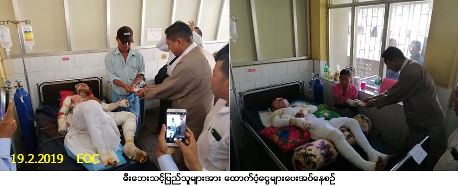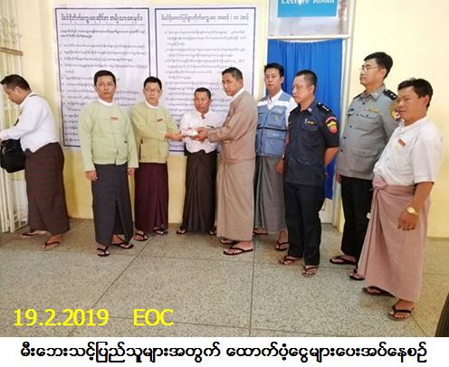 လူမှုဝန်ထမ်း၊ ကယ်ဆယ်ရေးနှင့် ပြန်လည်နေရာချထားရေးဝန်ကြီးဌာန၊ ဘေးအန္တရာယ်ဆိုင်ရာစီမံခန့်ခွဲမှုဦးစီးဌာန၊ ရန်ကုန်တိုင်းဒေသကြီးဦးစီး မှူးရုံးမှတာဝန်ရှိသူများသည် ရန်ကုန်တိုင်းဒေသကြီး ၊ ရွှေပြည်သာမြို့နယ်၊ အမှတ် (၂၃) ရပ်ကွက်၊ ဆိပ်ကမ်းသာလမ်း ၊ အမှတ် (၃၃၈/၃၃၉) ရှိ ဟွန်ဒါမြန်မာ (Honda Myanmar) အထပ်သားစက်ရုံ၌ (၁၈-၂-၂၀၁၉) ရက်နေ့၊ (၁၈း၄၅) နာရီချိန်တွင် လွှစာမှုန့်များသို့ မီးကူးစက်ရာမှ ဘွိုင်လာပေါက်ကွဲပြီး မီးလောင်မှုဖြစ်ပွားခဲ့ပါသည်။ အဆိုပါဖြစ်စဉ်ကြောင့် လူဦးရေ (၁၃) ဦးဒဏ်ရာရပြီး (၁) ဦးသေဆုံးခဲ့ရာ ဒဏ်ရာရလူနာ (၁၃) ဦးအတွက် (၁) ဦးလျှင် (၅၀,၀၀၀/-) ကျပ်နှုန်းဖြင့် ထောက်ပံ့ငွေ (၆၅၀,၀၀၀/-) ကျပ်၊ သေဆုံးသူ (၁) ဦးအတွက် ထောက်ပံ့ငွေ (၃၀၀,၀၀၀/-) ကျပ်၊ စုစုပေါင်းထောက်ပံ့ငွေ (၉၅၀,၀၀၀/-) ကျပ်အား (၁၉-၂-၂၀၁၉) ရက်နေ့တွင် ရန်ကုန်တိုင်းဒေသကြီးမြောက်ပိုင်းခရိုင်၊ အင်းစိန် ပြည်သူ့ဆေးရုံ၌ ဘေးသင့်ပြည်သူများနှင့် ကျန်ရစ်သူမိသားစုဝင်ထံသို့ သက်ဆိုင်ရာမြို့နယ်အထွေထွေ အုပ်ချုပ်ရေးဦးစီးဌာနမှ တာဝန်ရှိသူများနှင့်အတူ ထောက်ပံ့ပေးခဲ့ပါကြောင်း သတင်းရရှိပါသည်။