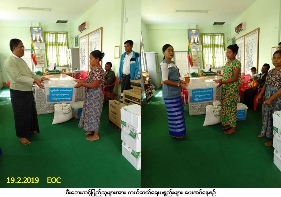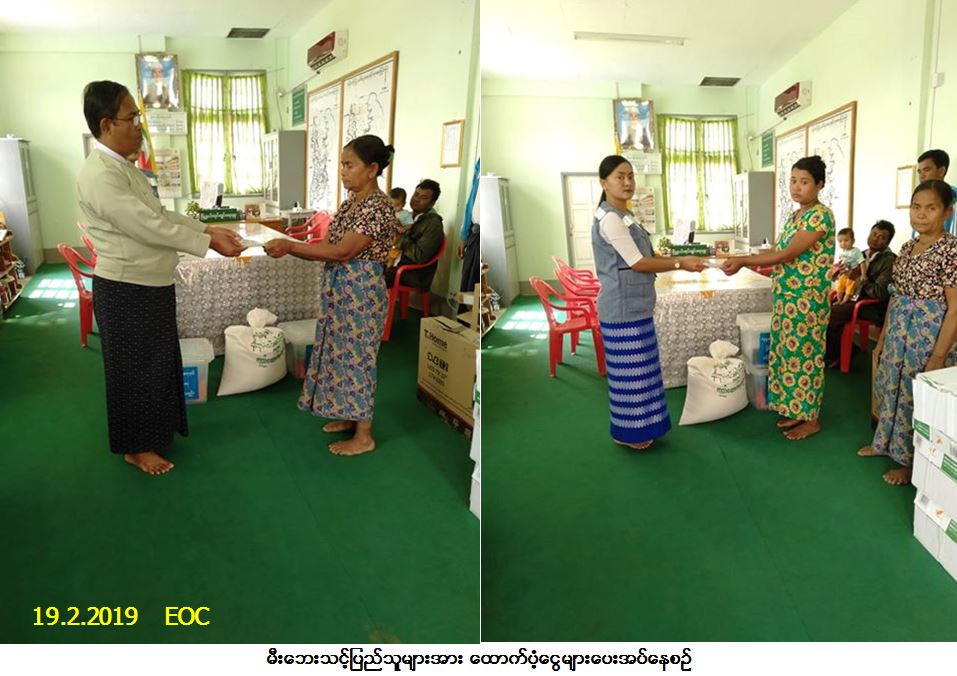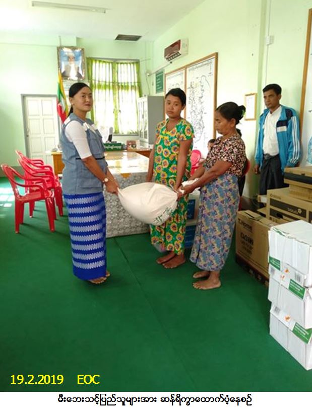 လူမှုဝန်ထမ်း၊ ကယ်ဆယ်ရေးနှင့် ပြန်လည်နေရာချထားရေးဝန်ကြီးဌာန၊ ဘေးအန္တရာယ်ဆိုင်ရာ စီမံခန့်ခွဲမှုဦးစီးဌာန၊ မြောက်ဦးခရိုင်ဦးစီးမှူးရုံးမှတာဝန်ရှိသူများသည် မြောက်ဦးမြို့နယ်၊ သာယာကုန်းကျေးရွာအုပ်စု၊ ဆင်ခြံကျေးရွာ၌ (၁၇-၂-၂၀၁၉) ရက်နေ့တွင်ဖြစ်ပွားခဲ့သော မီးဘေးကြောင့် ဘေးသင့်နေအိမ် (၂) လုံး၊ အိမ်ထောင်စု (၂) စုမှ လူဦးရေ (၉) ဦးဘေးသင့်ခဲ့ရာ အဆိုပါဘေးသင့်ပြည်သူများအတွက် ကယ်ဆယ်ရေးပစ္စည်း (၁၅) မျိုး (၂) အိမ်ထောင်စုစာ၊ အိမ်ဆောက်ပစ္စည်းဖိုးထောက်ပံ့ငွေ (၂၀၀,၀၀၀/-) ကျပ်နှင့် ဆန်ရိက္ခာ (၇) ရက်စာ (၁၅) ပြည်၊ (၆) ဗူးအား (၁၉-၂-၂၀၁၉) ရက်နေ့တွင် မြို့နယ်အုပ်ချုပ်ရေးမှူးနှင့်အတူ ဘေးသင့်ပြည်သူများထံသို့ လက်ဝယ် အရောက် ထောက်ပံ့ပေးအပ်ခဲ့ပါကြောင်း သတင်းရရှိပါသည်။