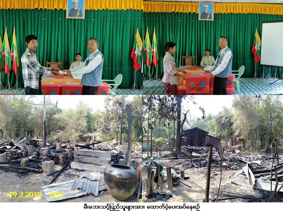လူမှုဝန်ထမ်း၊ ကယ်ဆယ်ရေးနှင့် ပြန်လည်နေရာချထားရေးဝန်ကြီးဌာန၊ ဘေးအန္တရာယ်ဆိုင်ရာ စီမံခန့်ခွဲမှုဦးစီးဌာန၊ရန်ကုန်တိုင်းဒေသကြီးဦးစီးမှူးရုံးမှတာဝန်ရှိသူများသည် မြောက်ပိုင်းခရိုင်၊ ထန်းတပင်မြို့နယ် ၊ ရေကျော်ကျေးရွာ၌ (၁၇-၂-၂၀၁၉) ရက်နေ့၊ (၀၂း၀၀) နာရီအချိန်တွင် မီးကြွင်းမီးကျန်မှတစ်ဆင့် ထင်းခြောက်များသို့ မီးကူးစက်၍ မီးလောင်မှုဖြစ်ပွားခဲ့ရာ နေအိမ် (၃) လုံး၊ အိမ်ထောင်စု (၃) စုမှ လူဦးရေ (၁၃) ဦးဘေးသင့်ခဲ့ပါသည်။ အဆိုပါဘေးသင့်ပြည်သူများအား အိမ်ဆောက်ပစ္စည်းဖိုးထောက်ပံ့ငွေ (၄၀၀,၀၀၀/-) ကျပ်၊ ဆန်ရိက္ခာ (၇) ရက်စာဖိုးထောက်ပံ့ငွေ (၂၇,၃၀၀/-) ကျပ်၊ စုစုပေါင်းထောက်ပံ့ငွေ (၄၂၇,၃၀၀/-) ကျပ်၊ ကယ်ဆယ်ရေးပစ္စည်း (၁၆) မျိုး (၃) အိမ်ထောင်စုစာ၊ ရေသန့် (၅) လီတာဗူး (၁၃) ဗူး၊ စားဆီ (၅) ပိဿာ (၁) ပုံးအား (၁၉-၂-၂၀၁၉) ရက်နေ့တွင် ဘေးသင့်ပြည်သူများလက်ဝယ်သို့ သက်ဆိုင်ရာမြို့နယ်အထွေထွေအုပ်ချုပ်ရေးဦးစီးဌာနမှ တာဝန်ရှိသူများနှင့်အတူ ထောက်ပံ့ပေးခဲ့ပါကြောင်း သတင်းရရှိပါသည်။