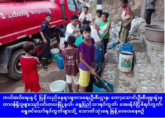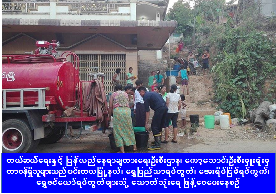ကယ်ဆယ်ရေးနှင့် ပြန်လည်နေရာချထားရေးဦးစီးဌာန၊ ကော့သောင်းဦးစီးမှူးရုံးမှ တာဝန်ရှိသူများနှင့် မီးသတ်ဦးစီးဌာနမှ တာဝန်ရှိသူများပူးပေါင်း၍ (၂၅-၄-၂၀၁၆) ရက်နေ့တွင် တနင်္သာရီတိုင်းဒေသကြီး ၊ ကော့သောင်းမြို့နယ်၊ ရွှေပြည်သာရပ်ကွက်၊ အေးရိပ်ငြိမ်ရပ်ကွက်နှင့် ရွှေဇင်ယော်ရပ်ကွက်များရှိ ပြည်သူများအတွက် သောက်သုံးရေ ဂါလံ (၉၆၀) ကို သွားရောက်ဖြန့်ဝေပေးခဲ့ကြောင်း သိရှိရပါသည်။