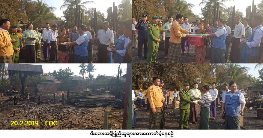 လူမှုဝန်ထမ်း၊ ကယ်ဆယ်ရေးနှင့် ပြန်လည်နေရာချထားရေးဝန်ကြီးဌာန၊ ဘေးအန္တရာယ်ဆိုင်ရာစီမံခန့်ခွဲမှုဦးစီးဌာန၊ ပြည်ထောင်စုနယ်မြေ၊ နေပြည်တော်တိုင်းဦးစီးမှူးရုံးမှတာဝန်ရှိသူများသည် ပျဉ်းမနားမြို့နယ်၊ သစ်လေးလုံးအုပ်စု၊ ပုရွက်ဆိတ်ကုန်းကျေးရွာ၌ (၁၉-၂-၂၀၁၉) ရက်နေ့၊ (၁၀း၁၅) အချိန်တွင် လျှပ်စစ်ပစ္စည်း(ဒယ်နီ) သုံးစွဲမှုမှတစ်ဆင့် မီးလောင်မှုဖြစ်ပွားခဲ့ရာ နေအိမ် (၃) လုံး မီးလောင်ပျက်စီးခဲ့သည့်အတွက် အိမ်ဆောက်ပစ္စည်းဖိုး ထောက်ပံ့ငွေ (၅၀၀,၀၀၀/-) ကျပ်၊ မီးတားြကိုတင်ဖျက်သိမ်းနေအိမ် (၁) လုံးအတွက် အိမ်ဆောက်ပစ္စည်းဖိုး ထောက်ပံ့ငွေ (၁၀၀,၀၀၀/-) ကျပ်၊ ဒဏ်ရာရဆေးရုံတက်ပြည်သူ (၂) ဦးအတွက် ထောက်ပံ့ငွေ (၁၀၀,၀၀၀/-) ကျပ်၊ ဘေးသင့်လူဦးရေ (၁၆) ဦးအတွက် ဆန်ရိက္ခာဖိုးထောက်ပံ့ငွေ (၃၃,၆၀၀/-) ကျပ်၊ စုစုပေါင်းထောက်ပံ့ငွေ (၇၃၃,၆၀၀/-) ကျပ်၊ ကယ်ဆယ်ရေးပစ္စည်း (၁၇) မျိုး (၃) အိမ်ထောင်စုစာ၊ ကယ်ဆယ်ရေးပစ္စည်း (၁၁) မျိုး (၁) အိမ်ထောင်စာတို့အား (၁၉-၂-၂၀၁၉) ရက်နေ့၊ (၁၅း၃၀) နာရီအချိန်တွင် ဘေးအန္တရာယ်ဆိုင်ရာစီမံခန့်ခွဲမှုဦးစီး ဌာနမှတိုင်းဦးစီးမှူးနှင့်အတူ ပြည်သူများလက်ဝယ်အရောက် ကွင်းဆင်းထောက်ပံ့ပေးအပ်ခဲ့ပါကြောင်း သတင်း ရရှိပါသည်။