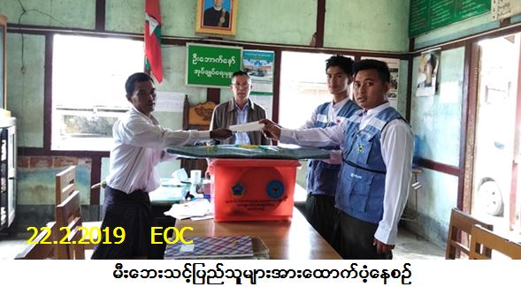 လူမှုဝန်ထမ်း၊ ကယ်ဆယ်ရေးနှင့် ပြန်လည်နေရာချထားရေးဝန်ကြီးဌာန၊ ဘေးအန္တရာယ်ဆိုင်ရာ စီမံခန့်ခွဲမှုဦးစီးဌာန၊ ကချင်ပြည်နယ်ဦးစီးမှူးရုံးမှတာဝန်ရှိသူများသည် ကချင်ပြည်နယ်၊ မြစ်ကြီးနားမြို့၊ တပ်ကုန်းအင်ဂျန်ဒုံရပ်ကွက်၌ (၁၃-၂-၂၀၁၉) ရက်နေ့တွင်ဖြစ်ပွားခဲ့သောမီးဘေးကြောင့် ဘေးသင့်နေအိမ် (၁) လုံး၊ အိမ်ထောင်စု (၁) စုမှ လူဦးရေ (၉) ဦးဘေးသင့်ခဲ့ရာ အဆိုပါဘေးသင့်ပြည်သူများအတွက် ကယ်ဆယ်ရေးပစ္စည်း (၁၇) မျိုး၊ ဆန်ရိက္ခာဖိုးထောက်ပံ့ငွေ (၁၈,၉၀၀/-) ကျပ်နှင့် အိမ်ဆောက်ပစ္စည်းဖိုးထောက်ပံ့ငွေ (၁၀၀,၀၀၀/-) ကျပ်အား (၂၂-၂-၂၀၁၉) ရက်နေ့၊ (၁၁:၃၀) အချိန်တွင် ဘေးသင့်ပြည်သူများထံသို့ သွားရောက်ထောက်ပံ့ပေးအပ် ခဲ့ပါကြောင်း သတင်းရရှိပါသည်။
