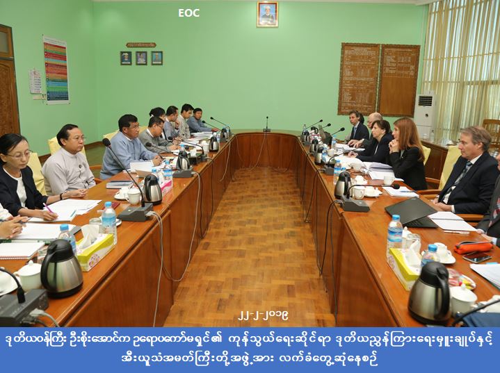 လူမှုဝန်ထမ်း၊ကယ်ဆယ်ရေးနှင့် ပြန်လည်နေရာချထားရေးဝန်ကြီးဌာန၊ ဒုတိယဝန်ကြီး ဦးစိုးအောင်အား ဥရောပကော်မရှင်၏ ကုန်သွယ်ရေးဆိုင်ရာ ဒုတိယညွှန်ကြားရေးမှူးချုပ် Mrs. Helena Konig ၊ ပြည်ပဆက်ဆံရေး ဆိုင်ရာ ဒုတိယဦးဆောင်ညွှန်ကြားရေးမှူး Mrs. Paola Pampaloni နှင့် မြန်မာနိုင်ငံဆိုင်ရာ EU သံအမတ်ကြီး Mr.Kristian Schmid ဦးဆောင်သော ကိုယ်စားလှယ်အဖွဲ့က အဆိုပါဝန်ကြီးရုံး အစည်းအဝေးခန်းမ၌ လာရောက် တွေ့ဆုံခဲ့ပါသည်။