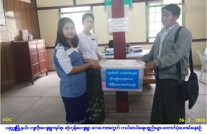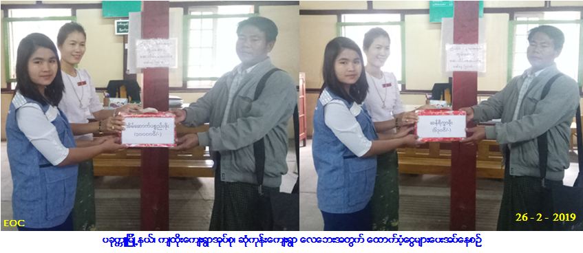 လူမှုဝန်ထမ်း၊ ကယ်ဆယ်ရေးနှင့် ပြန်လည်နေရာချထားရေးဝန်ကြီးဌာန၊ ဘေးအန္တရာယ်ဆိုင်ရာစီမံခန့်ခွဲမှုဦးစီးဌာန၊ ပခုက္ကူခရိုင်ဦးစီးမှူးရုံးမှ တာဝန်ရှိသူများသည် ပခုက္ကူမြို့နယ်၊ ကျထိုးကျေးရွာအုပ်စု၊ ဆုံကုန်းကျေးရွာ၌ (၂၅-၂-၂၀၁၉) ရက်နေ့၊ (၁၅း၃၀) နာရီအချိန်တွင် ဖြစ်ပွားခဲ့သော လေဘေးကြောင့် ဘေးသင့်ခဲ့သော အိမ်ခြေ (၁) လုံး၊ အိမ်ထောင်စု (၁) စုအတွက် ကယ်ဆယ်ရေးပစ္စည်း (၁၅) မျိုး (၁) အိမ်ထောင်စာ၊ အိမ်ဆောက်ပစ္စည်းဖိုးငွေ (၁၀၀,၀၀၀/-) ကျပ်နှင့် လူဦးရေ (၃) ဦးအတွက် ဆန်ရိက္ခာဖိုးငွေ (၆,၃၀၀/-) ကျပ်တို့အား (၂၆-၂-၂၀၁၉) ရက်နေ့ တွင် အထွေထွေအုပ်ချုပ်ရေးဦးစီးဌာနမှ တာဝန်ရှိသူများနှင့်အတူ ကျထိုးကျေးရွာအုပ်စု၊ ဆုံကုန်းကျေးရွာ အုပ်ချုပ်ရေးမှူးထံသို့ လွှဲပြောင်းထောက်ပံ့ပေးအပ်ခဲ့ကြောင်း သတင်းရရှိပါသည်။