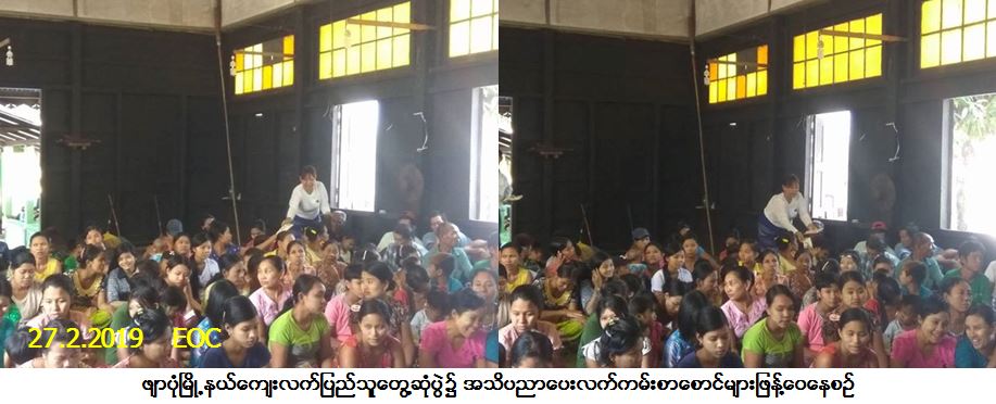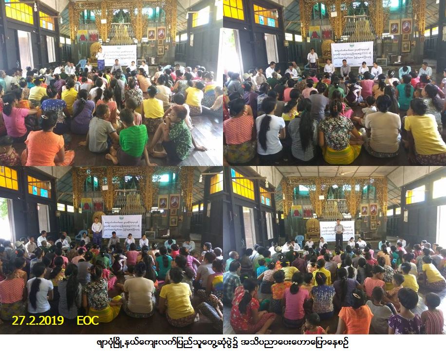 လူမှုဝန်ထမ်း၊ ကယ်ဆယ်ရေးနှင့် ပြန်လည်နေရာချထားရေးဝန်ကြီးဌာန၊ ဘေးအန္တရာယ်ဆိုင်ရာ စီမံခန့်ခွဲမှုဦးစီးဌာန၊ ဖျာပုံခရိုင်ဦးစီးမှူးရုံးမှတာဝန်ရှိသူများသည် ရေလုပ်သားအဖွဲ့ဖွံ့ဖြိုးမှု (FDA) အဖွဲ့နှင့် ဖျာပုံမြို့နယ်ဌာနဆိုင်ရာများနှင့်ပူးပေါင်း၍ (၂၇-၂-၂၀၁၉) ရက်နေ့တွင် ဖျာပုံမြို့နယ်၊ ကျုံတာရှမ်းကွင်းကျေးရွာအုပ်စု၊ ရွာလယ်ဓမ္မာရုံ၌ ကျေးလက်ပြည်သူတွေ့ဆုံပွဲအား ကျင်းပပြုလုပ်ခဲ့ရာ ဦးစီးဌာန၏ဆောင်ရွက်နေမှုအခြေအနေများ၊ ယခုရာသီ အချိန်တွင် ဖြစ်ပေါ်နေသည့်လေပြင်းဘေးနှင့် မီးဘေးကာကွယ်ရေးများနှင့်စပ်လျဉ်း၍ အသိပညာပေးဟောပြော ခြင်းတို့ဆောင်ရွက်ခဲ့ပါသည်။ အဆိုပါအခမ်းအနားသို့ ကျေးရွာသူ/သား (၁၀၀) ဦးတက်ရောက်ခဲ့ပြီး တက်ရောက်လာ သူများအားလက်ကမ်းစာစောင်များဖြန့်ဝေခဲ့ပါကြောင်း သတင်းရရှိပါသည်။