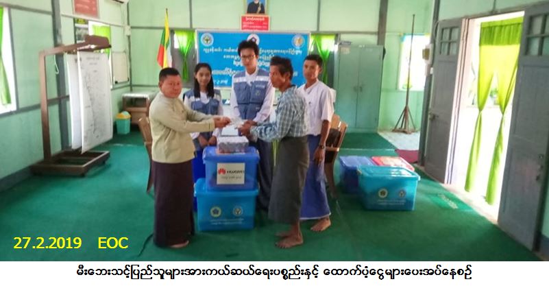 လူမှုဝန်ထမ်း၊ ကယ်ဆယ်ရေးနှင့် ပြန်လည်နေရာချထားရေးဝန်ကြီးဌာန၊ ဘေးအန္တရာယ်ဆိုင်ရာစီမံခန့်ခွဲမှုဦးစီးဌာန၊ ပဲခူးတိုင်းဒေသကြီးဦးစီးမှူးရုံးမှတာဝန်ရှိသူများသည် ရွှေကျင်မြို့နယ်၊ အင်္ဂနီကျေးရွာအုပ်စု၊ အင်္ဂနီကျေးရွာ၌ (၂၃-၂-၂၀၁၉) ရက်နေ့တွင်ဖြစ်ပွားခဲ့သောမီးဘေးကြောင့် ဘေးသင့်နေအိမ် (၁) လုံးအတွက် အိမ်ဆောက်ပစ္စည်းဖိုး ထောက်ပံ့ငွေ (၁၀၀,၀၀၀/-) ကျပ်၊ အိမ်ထောင်စု (၁) စုမှ လူဦးရေ (၈) ဦးအတွက် ဆန်ရိက္ခာ (၇) ရက်စာဖိုးထောက်ပံ့ငွေ (၁၆,၈၀၀/-) ကျပ်၊ စုစုပေါင်းထောက်ပံ့ငွေ (၁၁၆,၈၀၀/-) ကျပ်၊ ကယ်ဆယ်ရေးပစ္စည်း (၁၉) မျိုး (ပလပ်စတစ်ပုံးနှင့် ပြင်ပမှ ဝယ်ယူသော ပစ္စည်း(၃)မျိုးအပါ)နှင့် Family Kit (၁) ပုံးတို့အား (၂၇-၂-၂၀၁၉) ရက်နေ့၊ နံနက် (၁၁:၃၀) အချိန်တွင် ရွှေကျင်မြို့နယ်အထွေထွေအုပ်ချုပ်ရေးမှူးရုံး အစည်းအဝေးခန်းမ၌ သွားရောက်ထောက်ပံ့ပေးအပ်ခဲ့ပါကြ ောင်း သတင်းရရှိပါသည်။