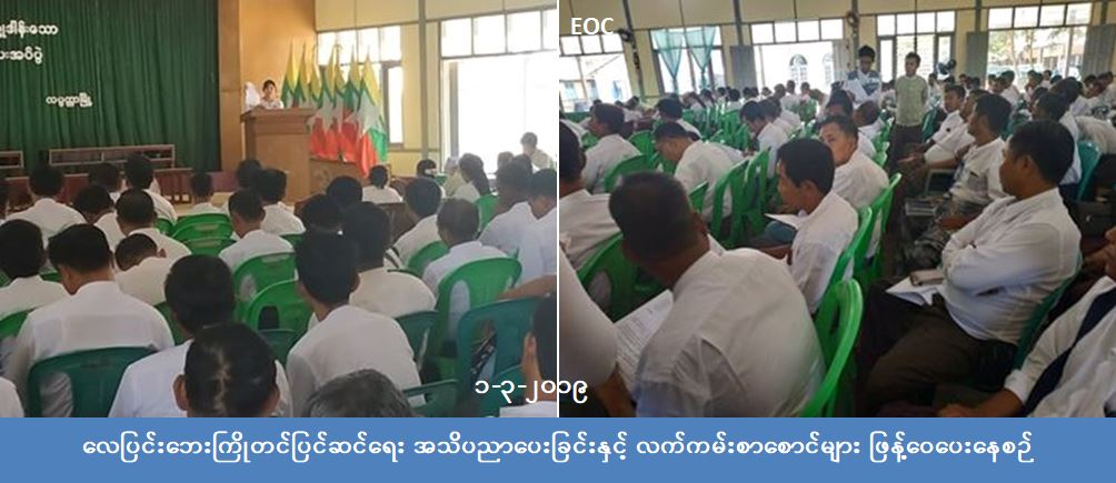 လူမှုဝန်ထမ်း၊ ကယ်ဆယ်ရေးနှင့် ပြန်လည်နေရာချထားရေးဝန်ကြီးဌာန၊ ဘေးအန္တရာယ်ဆိုင်ရာစီမံခန့်ခွဲမှုဦးစီးဌာန၊ လပွတ္တာခရိုင် ဦးစီးမှူးရုံးမှ တာဝန်ရှိသူများသည် (၁-၃-၂၀၁၉)ရက်နေ့တွင် လပွတ္တာမြို့နယ် အထွေထွေအုပ်ချုပ်ရေးဦးစီး ဌာန အစည်းအဝေးခန်းမ၌ လစဉ်ပြုလုပ်သော လုပ်ငန်းညှိနှိုင်းအစည်းအဝေးသို့ တတ်ရောက်လာသော ရပ်/ကျေးနှင့် ကျေးရွာအုပ်စုအုပ်ချုပ်ရေးမှူး၊ စုစုပေါင်း (၁၆၀) ဦးတို့အား လေပြင်းဘေးကြိုတင်ပြင်ဆင်ရေး အသိပညာပေးခြင်းနှင့် ရာအိမ်မှုးများသို့ လေပြင်းဘေးကြိုတင်ပြင်ဆင်ရေး ပြည်သူ သို့ပန်ကြားချက် လက်ကမ်းစာစောင် (၆၆၅)စောင်အား ဖြန့်ဝေပေးခြင်းတို့ ပြုလုပ်ခဲ့ကြောင်း သိရှိရပါသည်။
