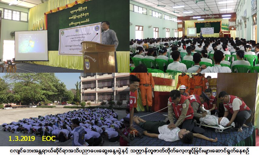 လူမှုဝန်ထမ်း၊ ကယ်ဆယ်ရေးနှင့် ပြန်လည်နေရာချထားရေးဝန်ကြီးဌာန၊ ဘေးအန္တရာယ်ဆိုင်ရာ စီမံခန့်ခွဲမှုဦးစီးဌာန၊ ဧရာဝတီတိုင်းဒေသကြီးဦးစီးမှူးရုံးမှတာဝန်ရှိသူများသည် မီးသတ်ဦးစီးဌာန၊ ကြက်ခြေနီအသင်းတို့နှင့် ပူးပေါင်း၍ (၁-၃-၂၀၁၉) ရက်နေ့၊ (၁၄း၀၀)နာရီအချိန်မှ (၁ရး၀၀)နာရီအချိန်အထိ ဧရာဝတီတိုင်းဒေသကြီး၊ ပုသိမ်မြို့၊ ပညာရေးကောလိပ်၊ ပညာရတနာခန်းမ၌ ငလျင်ဘေးအန္တရာယ်ဆိုင်ရာအသိပညာပေးဆွေးနွေးပွဲနှင့် သဏ္ဌာန်တူဇာတ်တိုက်လေ့ကျင့်ခြင်းတို့ အားဆောင်ရွက်ခဲ့ရာ ဆရာ/ဆရာမ၊ သင်တန်းသား/သူ (၄၅၀) ဦး တက်ရောက်ခဲ့ပါကြောင်းသတင်းရရှိပါသည်။