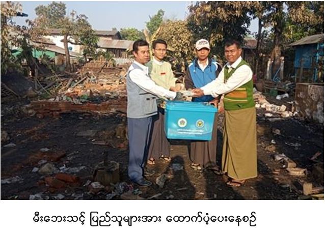 မီးဘေးကြောင့် တစ်စိတ်တစ်ပိုင်းပျက်စီးခဲ့သောအိမ်ခြေ (၁) လုံး၊ ၎င်းအိမ်ထောင်စု (၁) စုရှိ လူဦးရေ (၂) ဦး တို့အတွက် (၁၈၅၁၀) ကျပ် တန်ဖိုးရှိသော ကယ်ဆယ်ရေးပစ္စည်း (၁၀) မျိုး (၁) အိမ်ထောင်စုစာကိုလည်းကောင်း၊ အိမ်ဆောက်ပစ္စည်းဖိုး (၁၀၀၀၀၀) ကျပ်၊ ဆန်ရိက္ခာဖိုး (၄၂၀၀) ကျပ်ကိုလည်းကောင်း၊ စုစုပေါင်းထောက်ပံ့ရန်ပုံငွေ (၁၀၄၂၀၀) ကျပ် ကိုလည်းကောင်း care myanmar ပိုက်ဖျာ(၁)ချပ်ကိုလည်းကောင်း၊ (၈-၃-၂၀၁၉) ရက်နေ့တွင် အင်္ဂပူမြို့နယ်အထွေထွေအုပ်ချုပ်ရေးဦးစီးဋ္ဌာနမှ တာဝန်ရှိသူများနှင့်အတူ ဘေးသင့်ပြည်သူများလက်ဝယ်သို့အရောက် ပေးပို့ထောက်ပံပေးအပ်ခဲ့ကြောင်း သတင်းရရှိပါသည်။