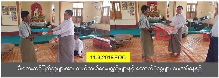 (၁၀ – ၃ – ၂၀၁၉) ရက်နေ့၊ (၁၆:၀၀) အချိန်တွင် ဥတ္တရသီရိမြို့နယ်၊ ရွှေနံ့သာရပ်ကွက် ၊ နယ်မြေ (၈) တွင် နေအိမ် (၂) လုံး မီးလောင်ကျွမ်းခဲ့သည့်အတွက် အိမ်ဆောက်ပစ္စည်းဖိုးထောက်ပံ့ငွေ (၂၀၀,၀၀၀ိ/-)ကျပ် မီးဘေးသင့်လူဦးရေ (၁၀) ဦးအတွက် ဆန်ရိက္ခာဖိုးငွေဖိုးထောက်ပံ့ငွေ (၂၁,၀၀၀ိ/-) ကျပ်၊ စုစုပေါင်း (၂၂၁,၀၀၀ိ/-)ကျပ်နှင့် (၇၅၃၆၂ိ/-) ကျပ် တန်းဖိုးရှိ ကယ်ဆယ်ရေးပစ္စည်း (၁၇) မျိုး (၂) အိမ်ထောင် စုစာတို့အား ဘေးအန္တရာယ်ဆိုင်ရာစီမံခန့့်ခွဲမှုဦးစီးဌာန၊ ပြည်ထောင်စုနယ်မြေ၊ နေပြည်တော်တိုင်းဦးစီးမှူးရုံးမှ တာဝန်ရှိသူများမှ (၁၁ – ၃ – ၂၀၁၉) ရက်နေ့၊ (၁၄း၃၀) အချိန် တွင်ပြည်သူများလက်ဝယ်သို့ ကွင်းဆင်းထောက်ပံ့ခဲ့ပါကြောင်း သတင်းရရှိပါသည်။ #ha_ fir #npw_mar2019 Source: ပြည်ထောင်စုနယ်မြေ၊ နေပြည်တော်တိုင်းဦးစီးမှူးရုံး (ဘစမ)