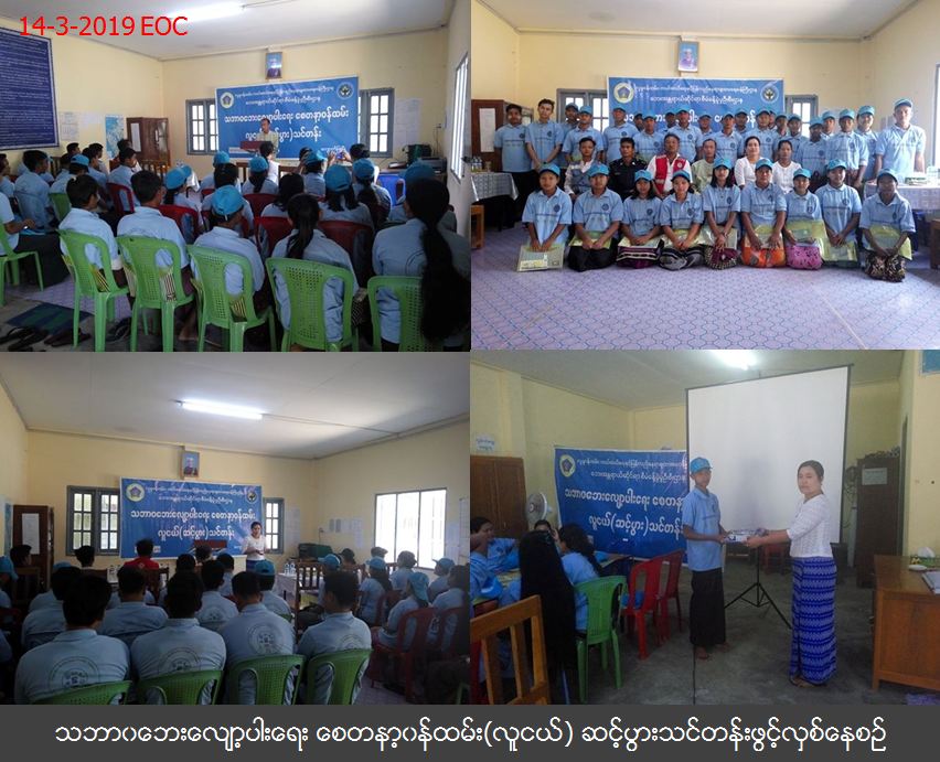 လူမှုဝန်ထမ်း၊ ကယ်ဆယ်ရေးနှင့် ပြန်လည်နေရာချထားရေးဝန်ကြီးဌာန၊ ဘေးအန္တရာယ်ဆိုင်ရာစီမံခန့်ခွဲမှု ဦးစီးဌာန၊ သဘာဝဘေးလျော့ပါးရေးစေတနာ့ဝန်ထမ်း (လူငယ်)ဆင့်ပွားသင်တန်းအား ကျောက်ဖြူခရိုင်ဦးစီးမှူးရုံး၌ဖွင့်လှစ်ခဲ့ရာ ကျောက်ဖြူမြို့နယ်အုပ်ချုပ်ရေးမှူးမှ အဖွင့်အမှာစကားပြောကြားခဲ့ပြီး ကျောက်ဖြူခရိုင်ဦးစီးမှူးရုံးမှ သင်တန်းဖွင့်လှစ်ရခြင်းနှင့်ပတ်သက်၍ ရှင်းလင်းပြောကြားခဲ့ပါသည်။ သင်တန်းဖွင့်ပွဲကို မြို့နယ်အဆင့်ဌာနဆိုင်ရာများ၊ သင်တန်းသား/သူများ စုစုပေါင်း (၄၅) ဦး တက်ရောက်ခဲ့ပြီး သင်တန်းကာလမှာ (၁၃-၃-၂၀၁၉) ရက်နေ့မှ (၁၅-၃-၂၀၁၉) ရက်နေ့အထိ (၃) ရက်တာ ဖွင့်လှစ်ကျင်းပသွားမည်ဖြစ်ကြောင်း သတင်းရရှိပါသည်။ #ar #rke_mar 2019 Source: ကျောက်ဖြူခရိုင်ဦးစီးမှူးရုံး (ဘစမ)