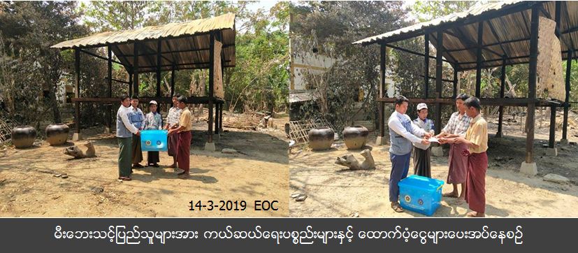 လူမှုဝန်ထမ်း၊ ကယ်ဆယ်ရေးနှင့် ပြန်လည်နေရာချထားရေးဝန်ကြီးဌာန၊ ဘေးအန္တရာယ်ဆိုင်ရာစီမံခန့်ခွဲမှု ဦးစီးဌာန၊ မိုးညိုမြို့နယ်ဦးစီးမှူးရုံးမှ တာဝန်ရှိသူများသည် (၁၄-၃-၂၀၁၉) ရက်နေ့၊ မိုးညိုမြို့နယ်၊ အိုးဘိုကျွန်းကျေးရွာအုပ်စု၊ အိုးဘကျွန်းကျေးရွာတွင် (၁၁-၃-၂၀၁၉) ရက်နေ့၌ ဖြစ်ပွားခဲ့သော မီးဘေးကြောင့် မီးဘေးသင့် အိမ်ခြေ (၁) လုံးအတွက် အိမ်ဆောက်ပစ္စည်းဖိုးထောက်ပံ့ငွေ (၁,၀၀,၀၀ဝိ/-)၊ ဘေးသင့်ပြည်သူ (၅) ဦးအတွက် ဆန်ရိက္ခာဖိုးထောက်ပံ့ငွေ (၁၀,၅၀ဝိ/-)နှင့် အိမ်ထောင်စု (၁) စုအတွက် ကယ်ဆယ်ရေးပစ္စည်း (၁၅) မျိုးပါ (၁) ပုံးတို့ကို မီးဘေးသင့်ပြည်သူများလက်ဝယ်သို့ ကွင်းဆင်းထောက်ပံ့ပေးအပ်ခဲ့ပါကြောင်း သတင်း ရရှိပါသည်။ #ha_fir #bgo_mar 2019 Source: မိုးညိုမြို့နယ်ဦးစီးမှူးရုံး (ဘစမ)