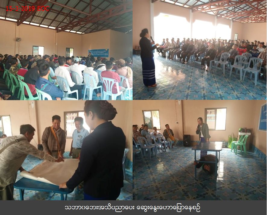 လူမှုဝန်ထမ်း၊ ကယ်ဆယ်ရေးနှင့် ပြန်လည်နေရာချထားရေးဝန်ကြီးဌာန၊ ဘေးအန္တရာယ်ဆိုင်ရာစီမံခန့်ခွဲမှု ဦးစီးဌာန၊ တာချီလိတ်မြို့နယ်ဦးစီမှုးရုံးမှ တာဝန်ရှိသူများသည် (၁၅-၃-၂၀၁၉) ရက်နေ့တွင် တာချီလိတ်မြို့နယ်၊ မိုင်းကိုးကျေးရွာအုပ်စု၊ ဟိုမိန်းစခန်းခန်းမ၌ သဘာဝဘေးအသိပညာပေးဟောပြောပွဲကို