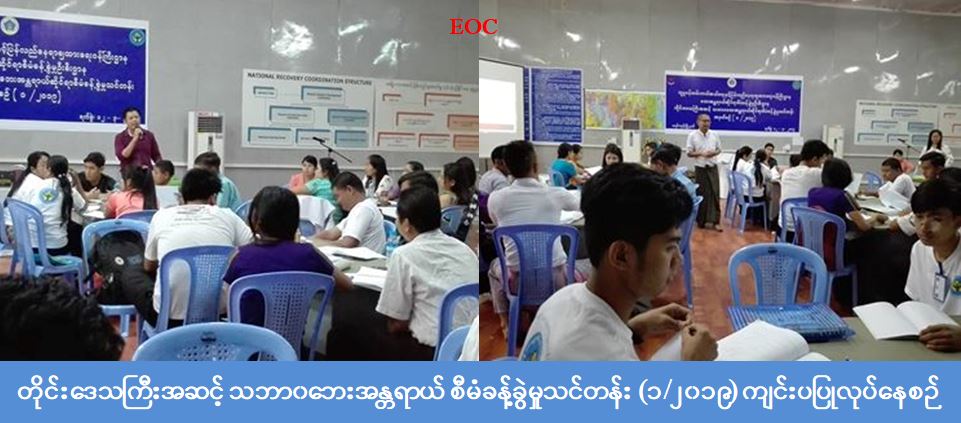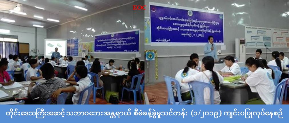 လူမှုဝန်ထမ်း၊ ကယ်ဆယ်ရေးနှင့် ပြန်လည်နေရာချထားရေးဝန်ကြီးဌာန၊ ဘေးအန္တရာယ်ဆိုင်ရာ စီမံခန့်ခွဲမှုဦးစီးဌာန၊ ရန်ကုန် တိုင်းဒေသကြီးဦးစီးမှူးရုံးမှ တာဝန်ရှိသူများသည် ရန်ကုန်တိုင်းဒေသကြီးဦးစီးမှူးရုံး၊ RCC ခန်းမ၌ (၁၂-၃-၂၁၀၉) ရက်နေ့ မှ (၁၅-၃-၂၀၁၉) ရက်နေ့အထိ တိုင်းဒေသကြီးအဆင့် သဘာ၀ဘေးအန္တရာယ် စီမံခန့်ခွဲမှုသင်တန်း (၁/၂၀၁၉) ကို သင်တန်း သား/သူ (၅၆) ဦးဖြင့် (၄) ရက်ကြာ ကျင်းပပြုလုပ်ခဲ့ကြောင်း သိရှိရပါသည်။