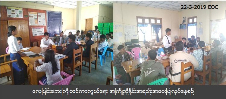 လူမှုဝန်ထမ်း၊ကယ်ဆယ်ရေးနှင့်ပြန်လည်နေရာချထားရေးဝန်ကြီးဌာန၊ ဘေးအန္တရာယ်ဆိုင်ရာစီမံခန့့်ခွဲမှုဦးစီးဌာန၊ ကသာခရိုင်ဦးစီးမှူးရုံးမှ တာဝန်ရှိသူများသည် ကသာမြို့နယ်၊ ချောင်းဝကျေးရွာအုပ်စု၊ ကချင်စုကျေးရွာနှင့် ငါးတဲကျေးရွာအုပ်စု၊ သံတောင်ကျေးရွာတို့တွင် လေဘေးကြိုတင်ကာကွယ်ရေး လုပ်ငန်းများဆောင်ရွက်နိုင်ရန်အတွက် (၂၂-၃-၂၀၁၈) ရက်နေ့တွင် ကသာခရိုင်ဦးစီးမှူးရုံး၌ အကြိုညှိနှိုင်းအစည်းအဝေးအား လူမှုရေးအသင်းအဖွဲ့များ၊ သက်ဆိုင်ရာကျေးရွာအုပ်ချုပ်ရေးမှူးများ၊ မီးသတ်တပ်ဖွဲ့၊ မြို့နယ်ထွေအုပ်တို့ဖြင့် ကျင်းပပြုလုပ်ခဲ့ကြောင်းသိရှိရပါသည်။ #ar #sgg_mar2019 Source: ကသာခရိုင်ဦးစီးမှူးရုံး