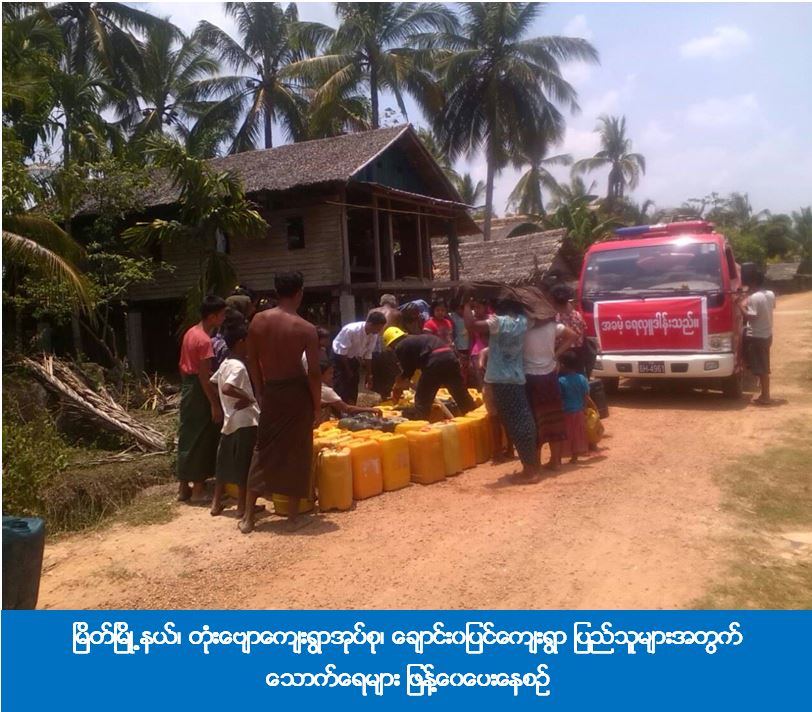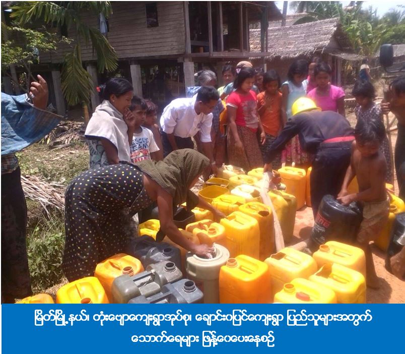ကယ်ဆယ်ရေးနှင့် ပြန်လည်နေရာချထားရေးဦးစီးဌာန၊ မြိတ်ခရိုင်ဦးစီးမှူးရုံးမှ (၂၇-၄-၂၀၁၆) ရက်နေ့တွင် မြိတ်မြို့နယ်၊ တုံးဗျောကျေးရွာအုပ်စု၊ ချောင်းဝပြင်ကျေးရွာရှိ အိမ်ခြေ (၉၇) အိမ်ထောင်စု (၁၀၆) စုမှ လူဦးရေ (၅၃၉) ဦးအတွက် သောက်ရေဂါလံ (၂၄၀၀) အား သွားရောက်ဖြန့်ဝေပေးခဲ့ကြောင်း သိရှိရပါသည်။