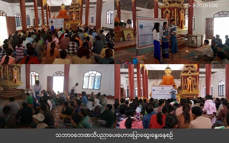 လူမှုဝန်ထမ်း၊ ကယ်ဆယ်ရေးနှင့် ပြန်လည်နေရာချထားရေးဝန်ကြီးဌာန၊ ဘေးအန္တရာယ်ဆိုင်ရာစီမံခန့်ခွဲမှုဦးစီးဌာန၊ မိုင်းပျဉ်းမြို့နယ်ဦးစီးမှူးရုံးမှ တာဝန်ရှိသူများသည် (၂၅-၃-၂၀၁၉) ရက်နေ့တွင် မိုင်းပျဉ်းမြို့နယ် ၊ ယမ်းမိုင်အုပ်စု၊ ယမ်းမိုင်ရွာနှင့် နားခေါရွာ၌ ပြည်သူ (၈၀) ဦးအား သဘာဝဘေး အသိပညာပေးဟောပြောဆွေးနွေးခဲ့ပါသည်။ အဆိုပါ ဟောပြောတွင် ဦးစီးဌာန၏ လုပ်ငန်းတာဝန်များ၊ ရည်ရွယ်ချက်များ၊ ထောက်ပံ့မှုနှုန်းထားများ၊ ဘေး (၈) မျိုး ဆောင်ရန်/ရှောင်ရန်များ၊ ငလျင်လှုပ်ခတ်စဉ်အတွင်း နေထိုင်ရမည့်အနေအထားများအား လက်တွေ့သရုပ်ပြခြင်းများဆောင်ရွက်ခဲ့ပြီး လက်ကမ်းစာစောင်များ