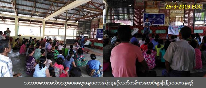 လူမှုဝန်ထမ်း၊ ကယ်ဆယ်ရေးနှင့် ပြန်လည်နေရာချထားရေးဝန်ကြီးဌာန၊ ဘေးအန္တရာယ်ဆိုင်ရာစီမံခန့်ခွဲမှု ဦးစီးဌာန၊ မြိတ်ခရိုင်ဦးစီးမှူးရုံးမှ တာဝန်ရှိသူများသည် (၂၅-၃-၂၀၁၉) ရက်နေ့တွင် ပုလောမြို့နယ်၊ ပုလောကုန်းကျေးရွာအုပ်စု၌ ပြည်သူ (၁၀၀) ဦးအား သဘာဝဘေးအသိပညာပေး ဟောပြောဆွေးနွေးခဲ့ပြီး လက်ကမ်းစာစောင်များနှင့် အမွှေးဆပ်ပြာခဲများ ဖြန့်ဝေပေးခဲ့ပါကြောင်း သိရှိရပါသည်။ #ar #tny_mar2019 Source: မြိတ်ခရိုင်ဦးစီးမှူးရုံး (ဘစမ)