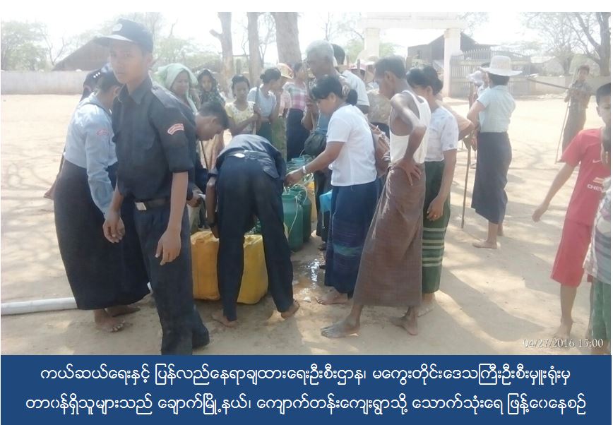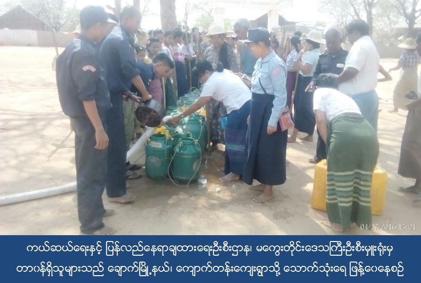ကယ်ဆယ်ရေးနှင့် ပြန်လည်နေရာချထားရေးဦးစီးဌာန၊ မကွေးတိုင်းဒေသကြီးဦးစီးမှူးရုံးမှ တာဝန်ရှိသူများသည် (၂၇-၄-၂၀၁၆) ရက်နေ့တွင် မကွေးတိုင်းဒေသကြီး၊ ချောက်မြို့နယ်၊ ကျောက်တန်းကျေးရွာရှိ အိမ်ခြေ (၁၂၆)လုံး၊ အိမ်ထောင်စု (၁၃၀)စု၊ လူဦးရေ (၇၄၆)ဦးတို့အတွက် သောက်သုံးရေ ဂါလံ (၃၂၀၀) အား ဖြန့်ဝေပေးခဲ့ကြောင်း သိရှိရပါသည်။