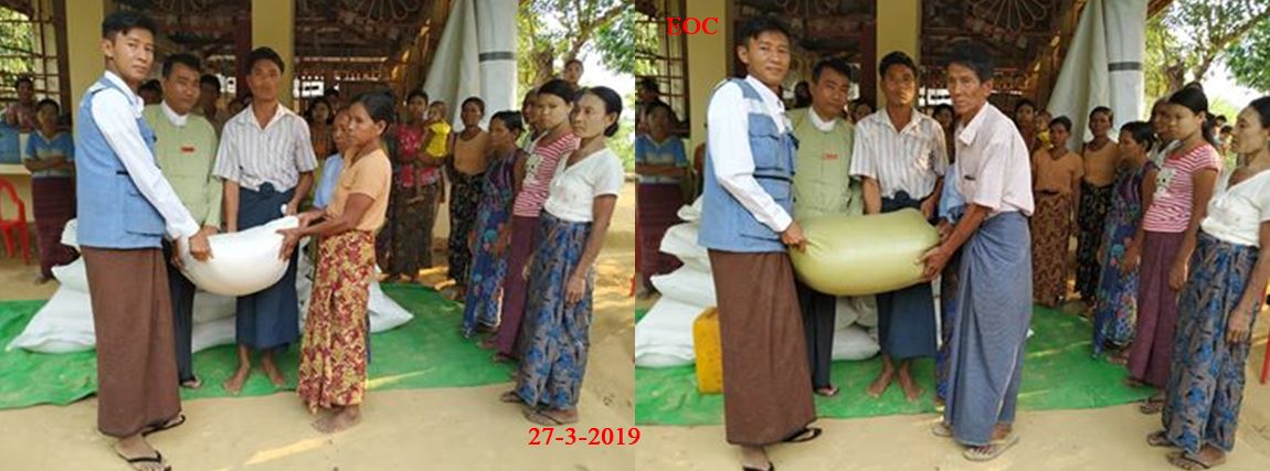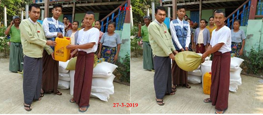 လူမှုဝန်ထမ်း၊ ကယ်ဆယ်ရေးနှင့်ပြန်လည်နေရာချထားရေးဝန်ကြီးဌာန၊ ဘေးအန္တရာယ်ဆိုင်ရာစီမံ ခန့်ခွဲမှုဦးစီး ဌာန၊ ဘူးသီးတောင်မြို့၊ အမှတ်၅ရပ်ကွက်၊ ရန်အောင်မြေဘုန်းတော်ကြီးကျောင်းသို့ ထပ်မံရောက်ရှိလာသော တိုက်ပွဲရှောင်ပြည်သူ (၁၂၈) ဦးအတွက် စားရိက္ခာ (၁၄)ရက်စာ ဆန် (၁၈)အိတ် (၁၆) ပြည်၊ ဆီ(၂၂.၄)ပိဿာ၊ ဆား (၄.၄၈)ပိဿာ၊ ပဲ (၈၉.၆)ပိဿာ နှင့် အမှတ် (၅)ရပ်ကွက် ရွှေကျင်ဘုန်းတော်ကြီးကျောင်းသို့ ထပ်မံရောက်ရှိလာသော တိုက်ပွဲရှောင်ပြည်သူ (၇၃) ဦးအတွက် စားရိက္ခာ (၁၄) ရက်စာ ဆန် (၁၀)အိတ် (၁၅)ပြည် (၄)ဘူး၊ ဆီ (၁၂.၇၇၅) ပိဿာ၊ ၊ ဆား (၂.၅၅၅) ပိဿာ၊ ပဲ (၅၁.၁)ပိဿာ၊ တို့အား (၂၇-၃-၂၀၁၉) ရက်နေ့တွင် ဘူးသီးတောင်မြို့နယ်၊ ဒုတိယမြို့နယ်အုပ်ချုပ်ရေးမှူးနှင့်အတူ ဘူးသီးတောင်မြို့နယ်ဦးစီးမှူးရုံးမှ ပြည်သူများ၏လက်ဝယ်အရောက် ထောက်ပံ့ပေးအပ်ခဲ့ကြောင်း သိရှိရပါသည်။