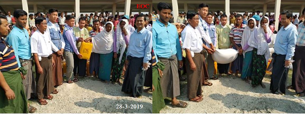 ဘူးသီးတောင်မြို့နယ်၊ ဖုံညိုလိပ်ကျေးရွာရှိ တိုက်ပွဲရှောင်ပြည်သူ (၆၃၆)ဦးအတွက် စားရိက္ခာ (၁၄) ရက်စာ ဆန် (၉၂)အိတ် (၁၈)ပြည်၊ ဆီ (၁၁၁.၃)ပိသာ၊ ဆား (၂၂.၂၆)ပိသာ၊ ပဲ (၄၄၅.၂) ပိသာ၊ ဝရကျွန်းကျေးရွာရှိ တိုက်ပွဲရှောင်ပြည်သူ (၂၇၅)ဦးအတွက် စားရိက္ခာ (၁၄)ရက်စာ ဆန် (၄၀)အိတ် (၂) ပြည် (၄)ဘူး၊ ဆီ(၄၈.၁၂၅)ပိသာ၊ ဆား (၉.၆၂၅)ပိသာ၊ ပဲ (၁၉၂.၅)ပိသာနှင့် ဆေးအိုးကျကျေးရွာရှိ တိုက်ပွဲရှောင်ပြည်သူ (၁၀၄)ဦးအတွက် စားရိက္ခာ (၁၄)ရက်စာ ဆန်(၁၅)အိတ် (၄) ပြည်၊ ဆီ(၁၈.၂)ပိသာ၊ ဆား(၃.၆၄)ပိသာ၊ ပဲ (၇၂.၈)ပိသာ တို့အား (၂၈-၃-၂၀၁၉ )ရက်နေ့တွင်၊ ဘူးသီးတောင်မြို့နယ် ဒုတိယမြို့နယ်အုပ်ချုပ်ရေးမှူး၊ လူမှုဝန်ထမ်း၊ ကယ်ဆယ်ရေးနှင့် ပြန်လည်နေရာ ချထားရေးဝန်ကြီးဌာန၊ ဘေးအန္တရာယ်ဆိုင်ရာစီမံ ခန့်ခွဲမှု ဦးစီးဌာန၊ မောင်တောခရိုင်ဦးစီးမှူး ဦးမောင်မောင်ကြီးတို့နှင့်အတူ ဘူးသီးတောင်မြို့ဦးစီးမှူးရုံးမှ ပြည်သူများလက်ဝယ်အရောက် ထောက်ပံ့ပေးအပ်ခဲ့ကြောင်း သိရှိရပါသည်။